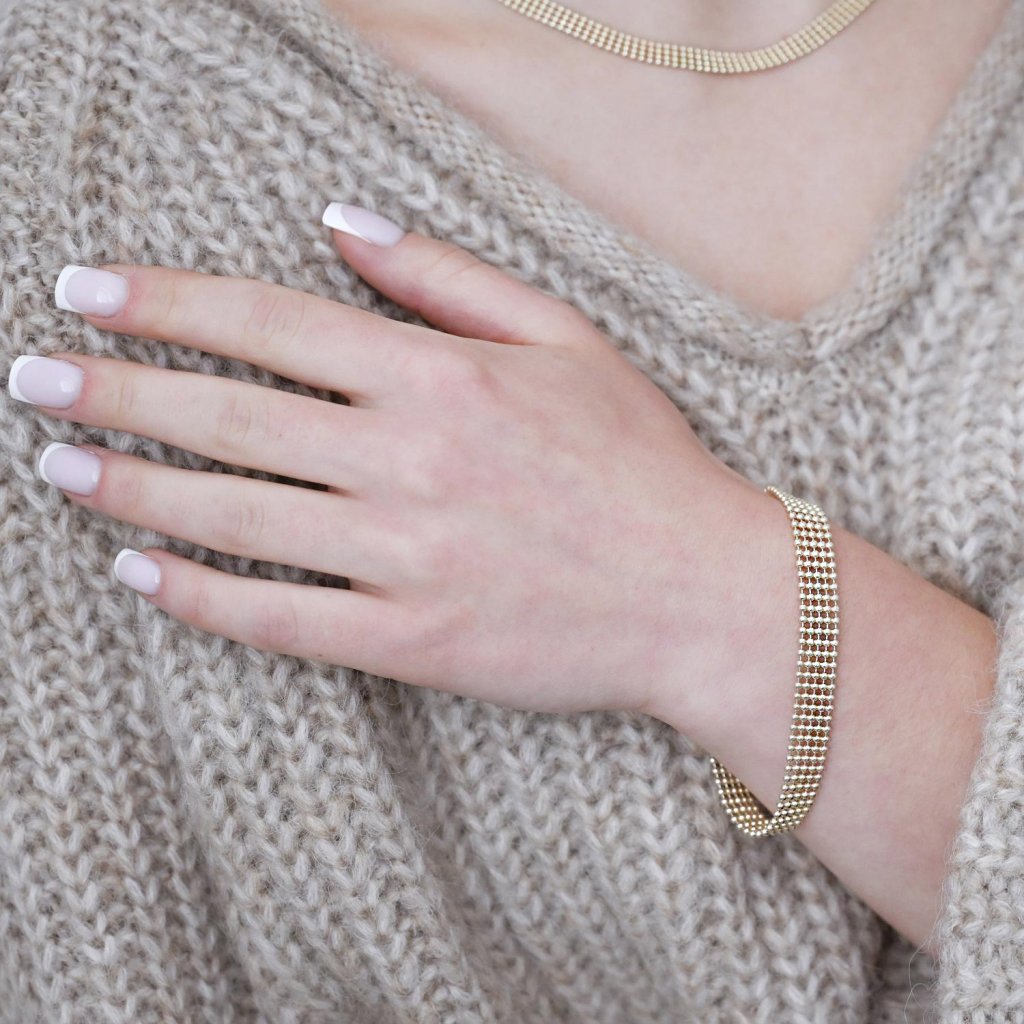 Náramek z pozlaceného stříbra, kde se pět hladkých linií drobných kuliček spojilo v jeden ucelený a elegantní celek. Díky pravidelnému uspořádání a decentnímu lesku působí jemně, ale zároveň pevně a výrazně.