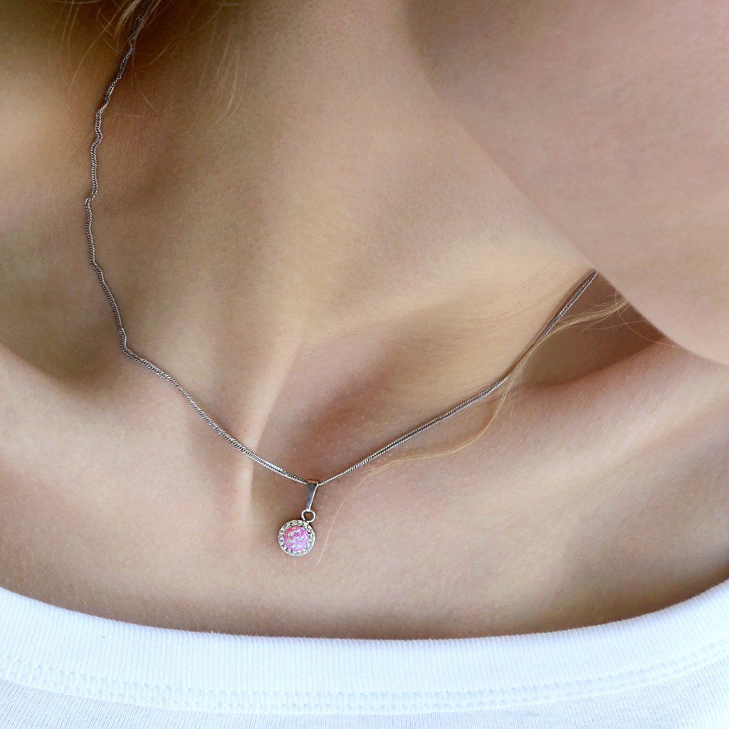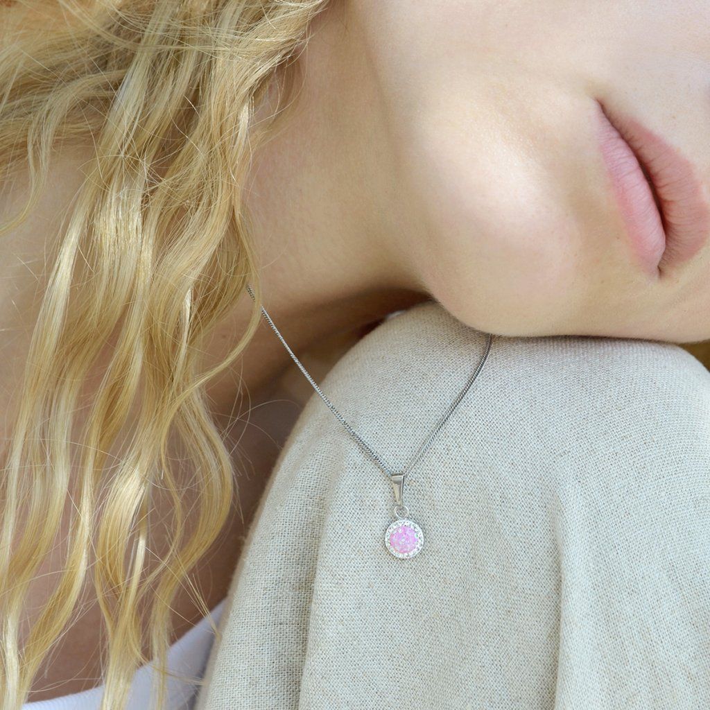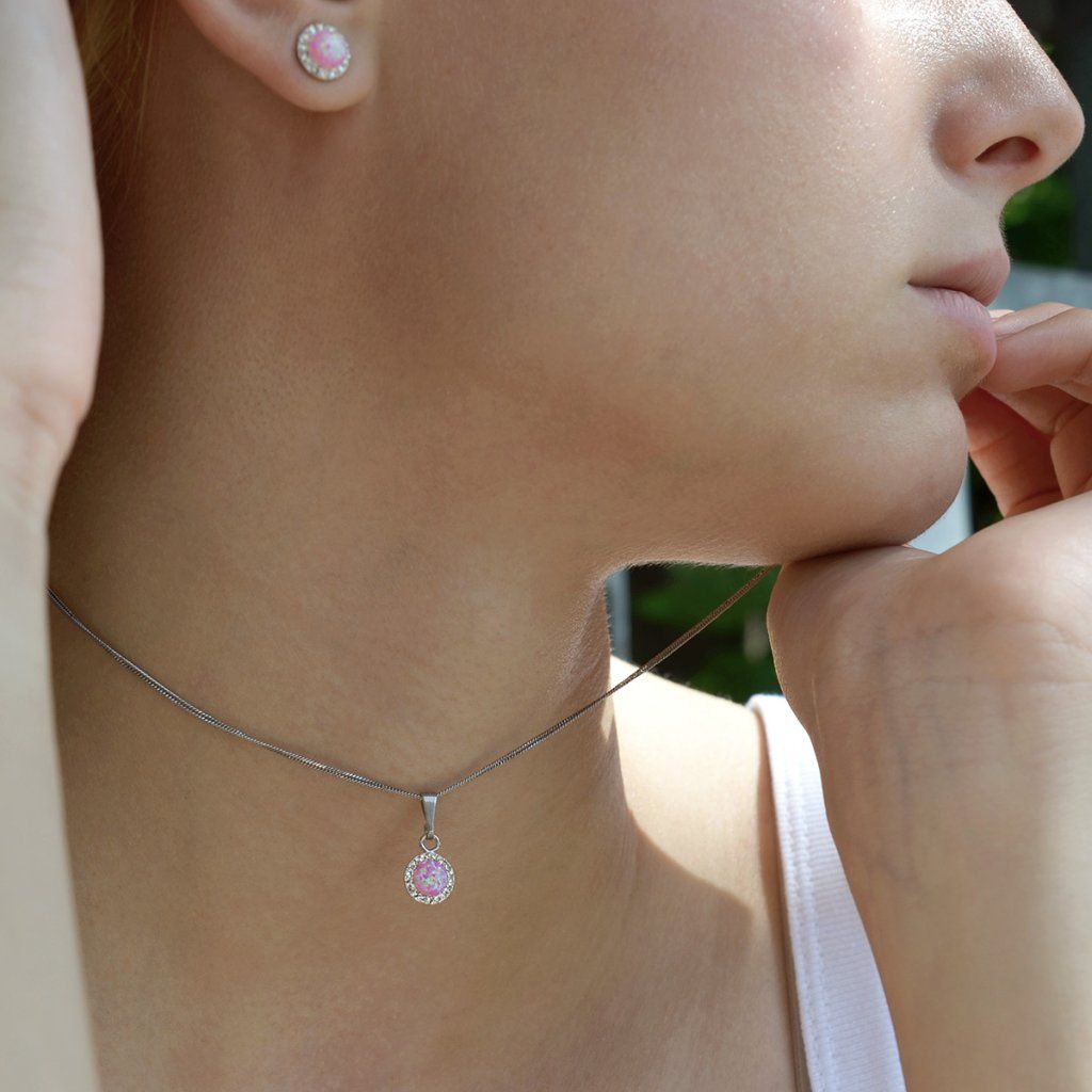 Náhrdelník obsahuje řetízek s kulatým přívěskem. Šperk je vyrobený ze stříbra ryzosti 925/1000, které prošlo povrchovou úpravou rhodiem. Rhodium chrání šperk proti zčernání, zežloutnutí i poškrábání. Přívěšek je zdobený růžovým syntetickým opálem, který je navíc olemován malými třpytivými Preciosa krystaly v bílé barvě. Můžete si k němu vybrat i stejné náušnice se zapínáním na puzetu nebo šroubek. Jelikož šperk neobsahuje žádný přídavek niklu, mohou ho bez obav nosit i alergici.