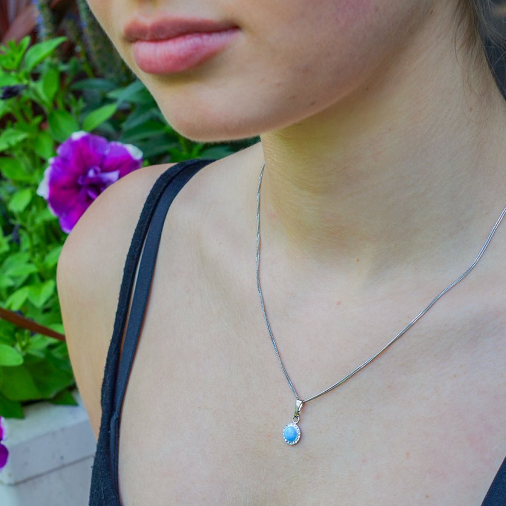 Náhrdelník obsahuje řetízek s kulatým přívěskem. Šperk je vyrobený ze stříbra ryzosti 925/1000, které prošlo povrchovou úpravou rhodiem. Rhodium chrání šperk proti zčernání, zežloutnutí i poškrábání. Přívěšek je zdobený světle modrým syntetickým opálem, který je navíc olemován malými třpytivými Preciosa krystaly v bílé barvě. Můžete si k němu vybrat i stejné náušnice se zapínáním na puzetu nebo šroubek. Jelikož šperk neobsahuje žádný přídavek niklu, mohou ho bez obav nosit i alergici.