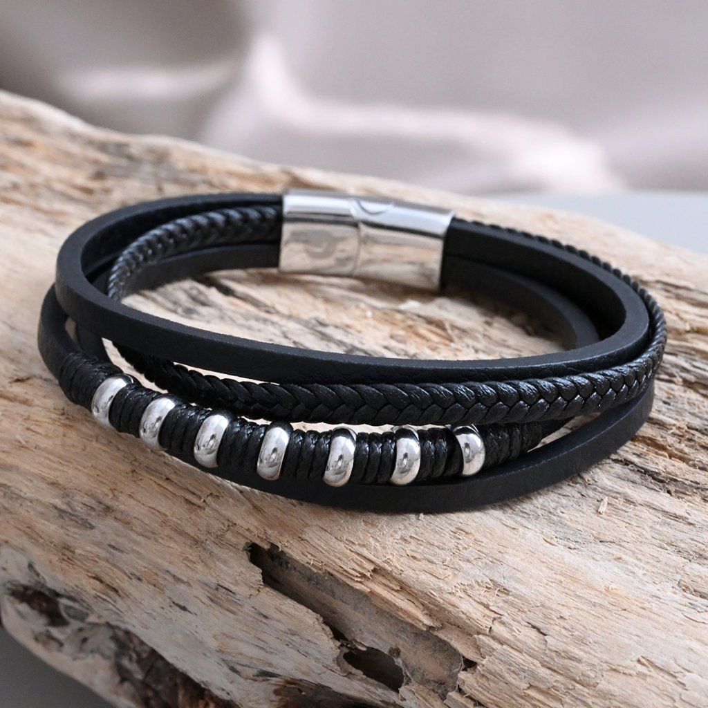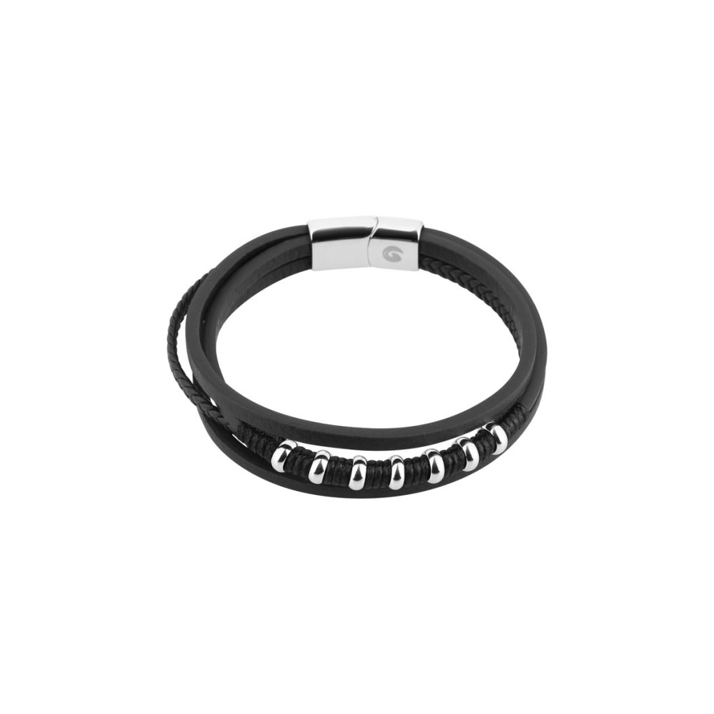 Pánský náramek je vyrobený ze čtyř různě tvarovaných pásků z černé recyklované kůže a ocelových kroužků.