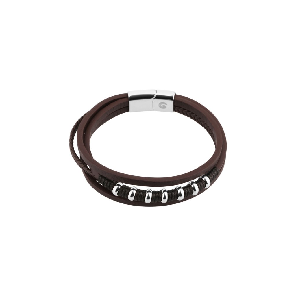 Pánský náramek je vyrobený ze čtyř různě tvarovaných pásků z hnědé recyklované kůže a ocelových kroužků.
