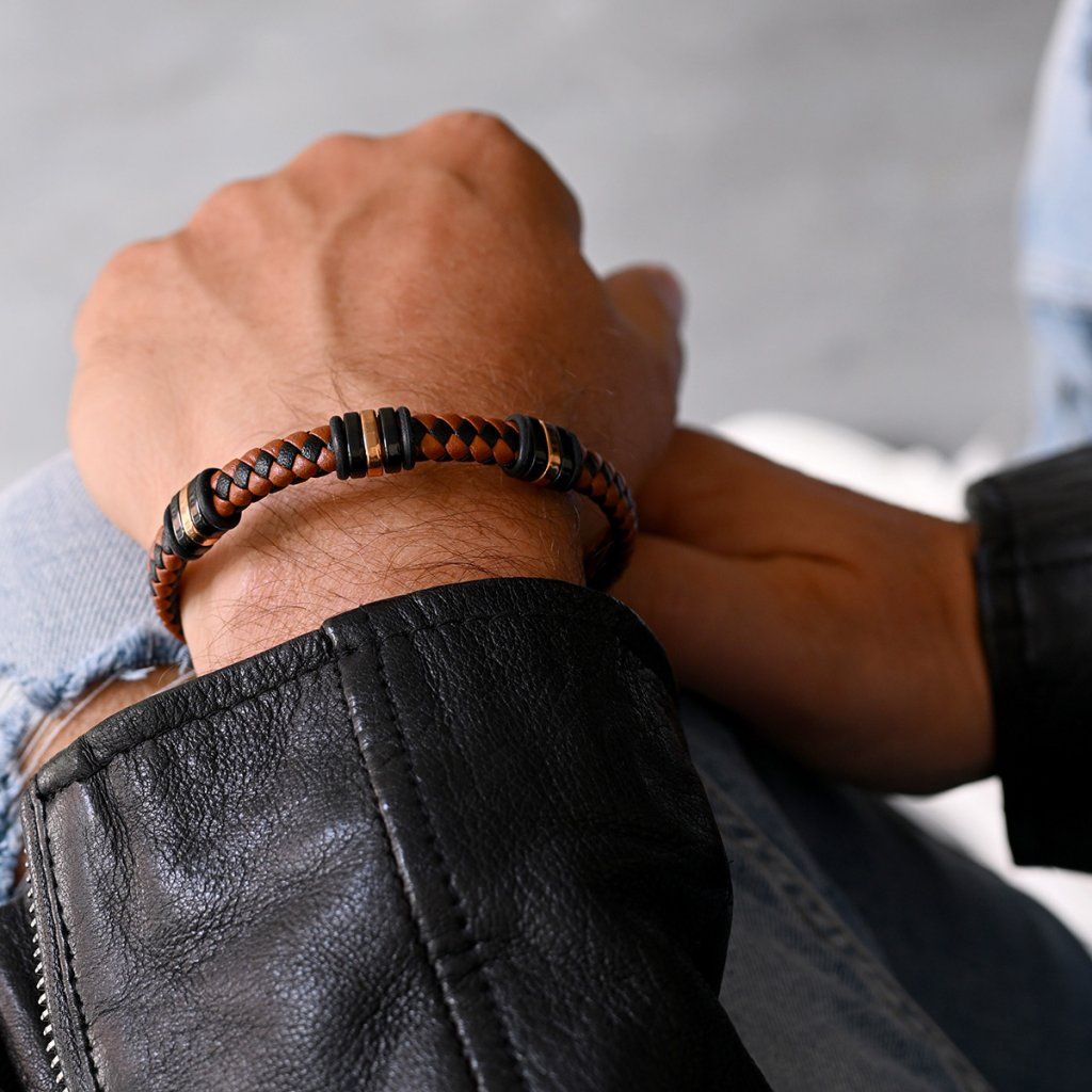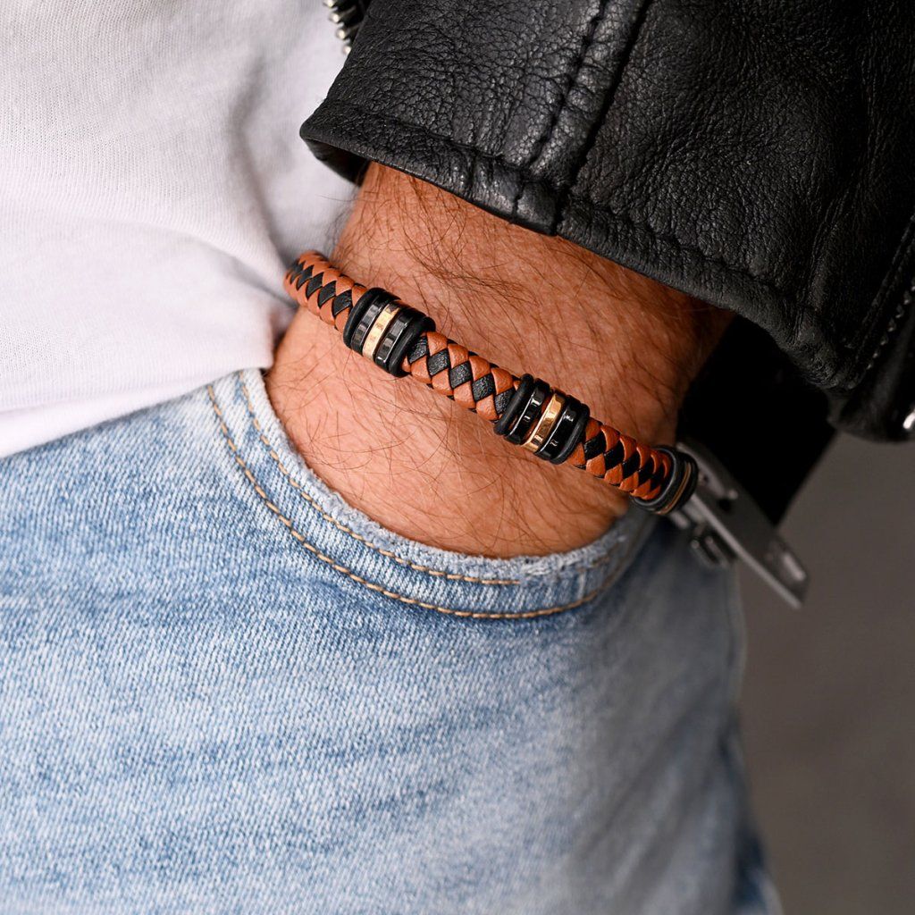 Náramek je vhodným dárkem pro elegantní muže a je tvořen zapletenými pásky z černé a světle hnědé PU kůže do kulatého průřezu.