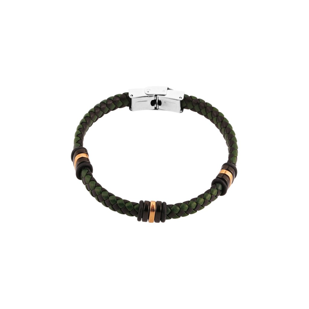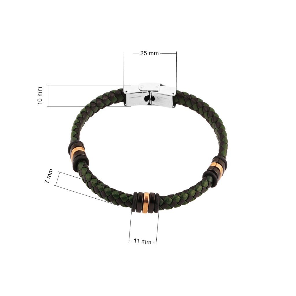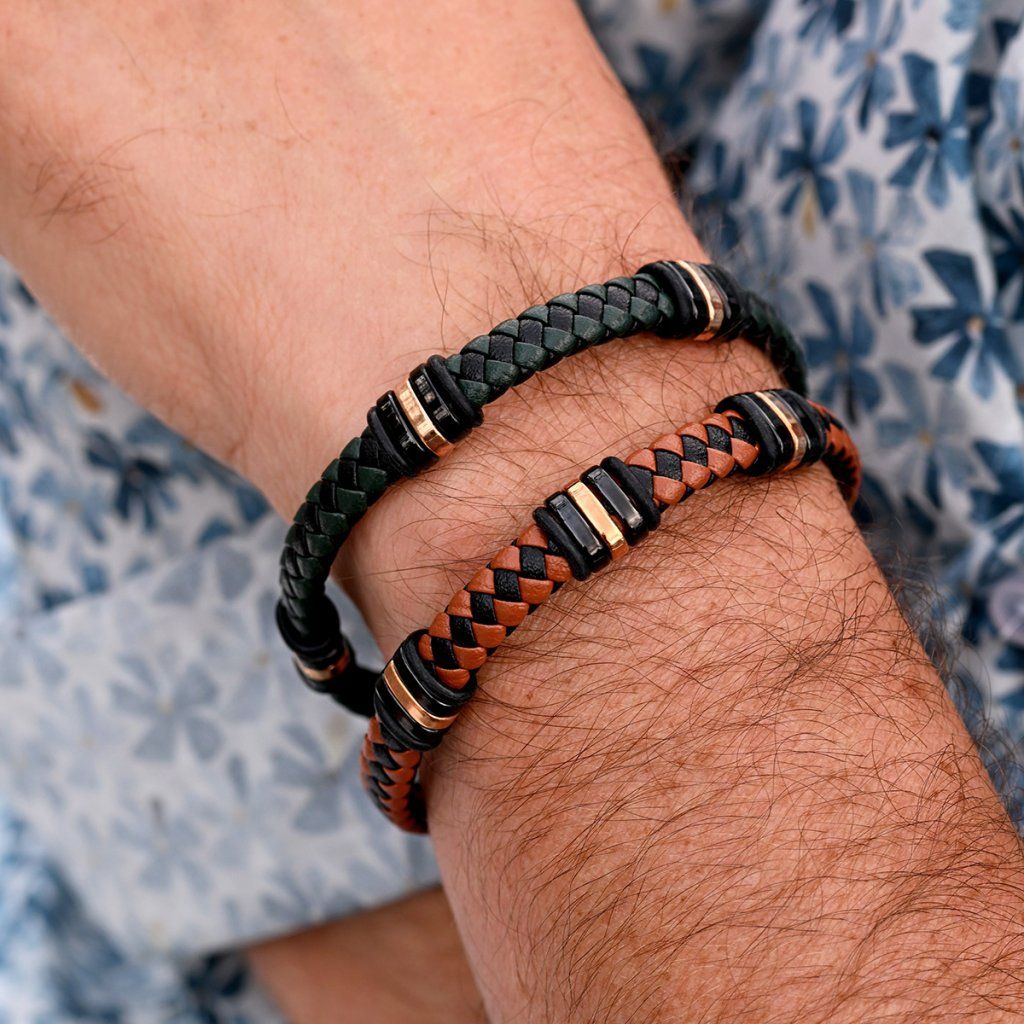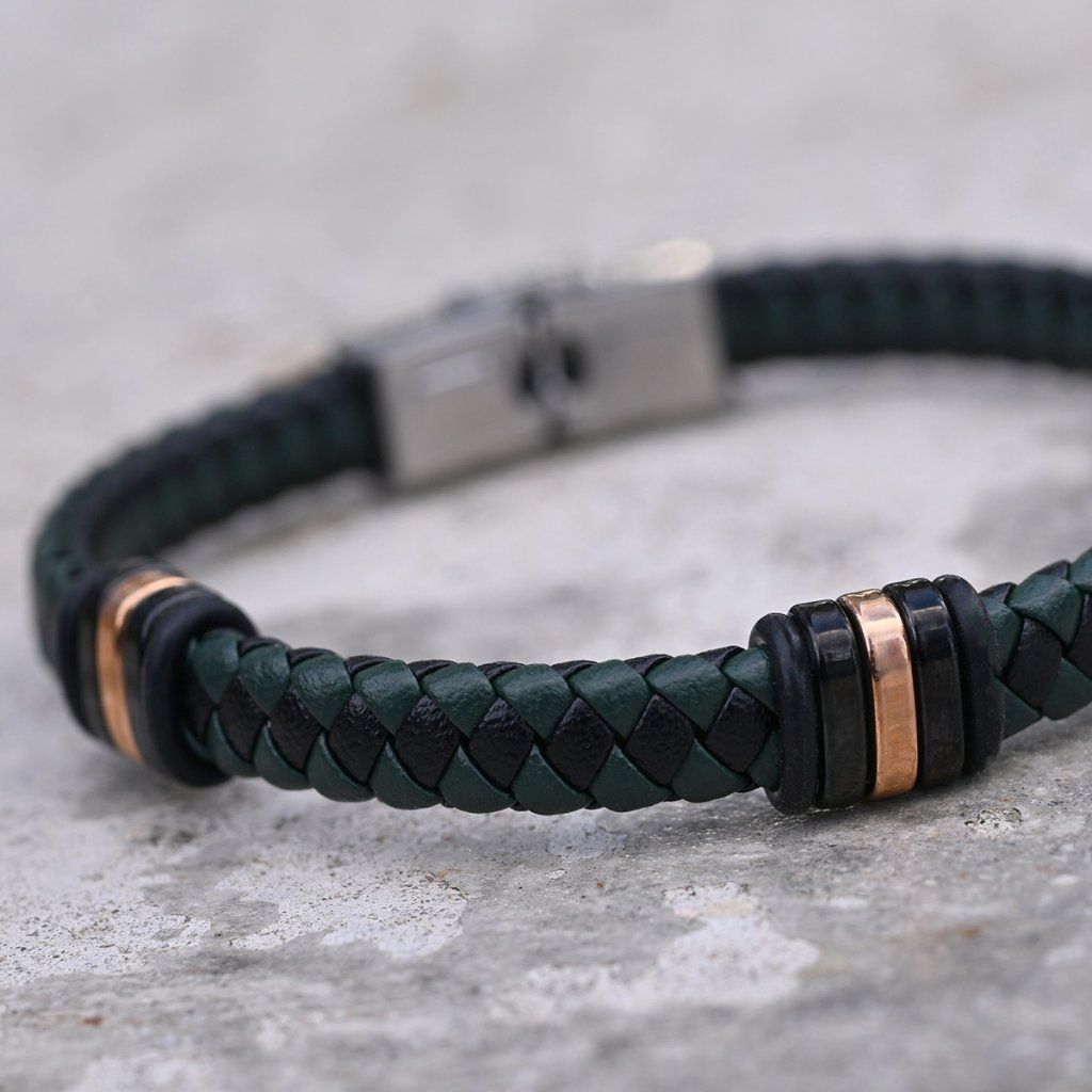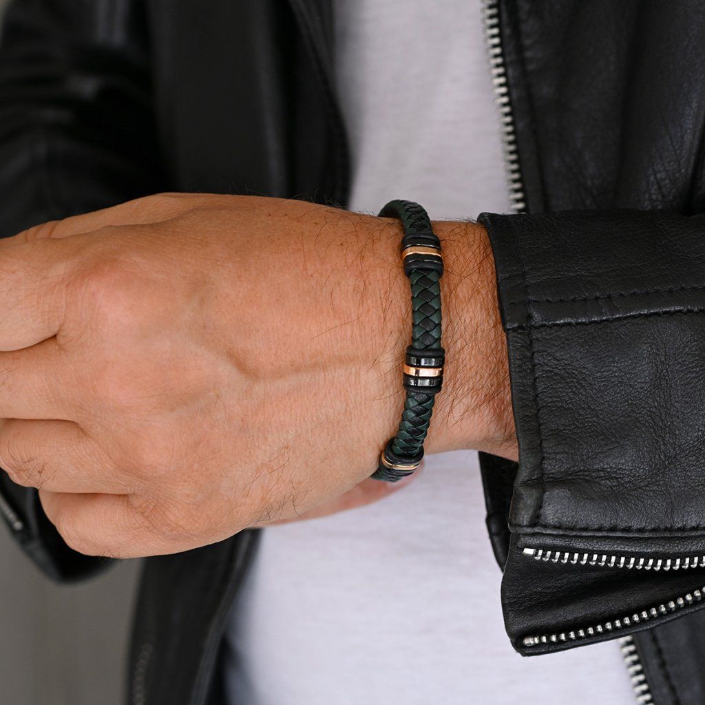 Náramek je vhodným dárkem pro elegantní muže a je tvořen zapletenými pásky z černé a tmavě zelené PU kůže do kulatého průřezu.