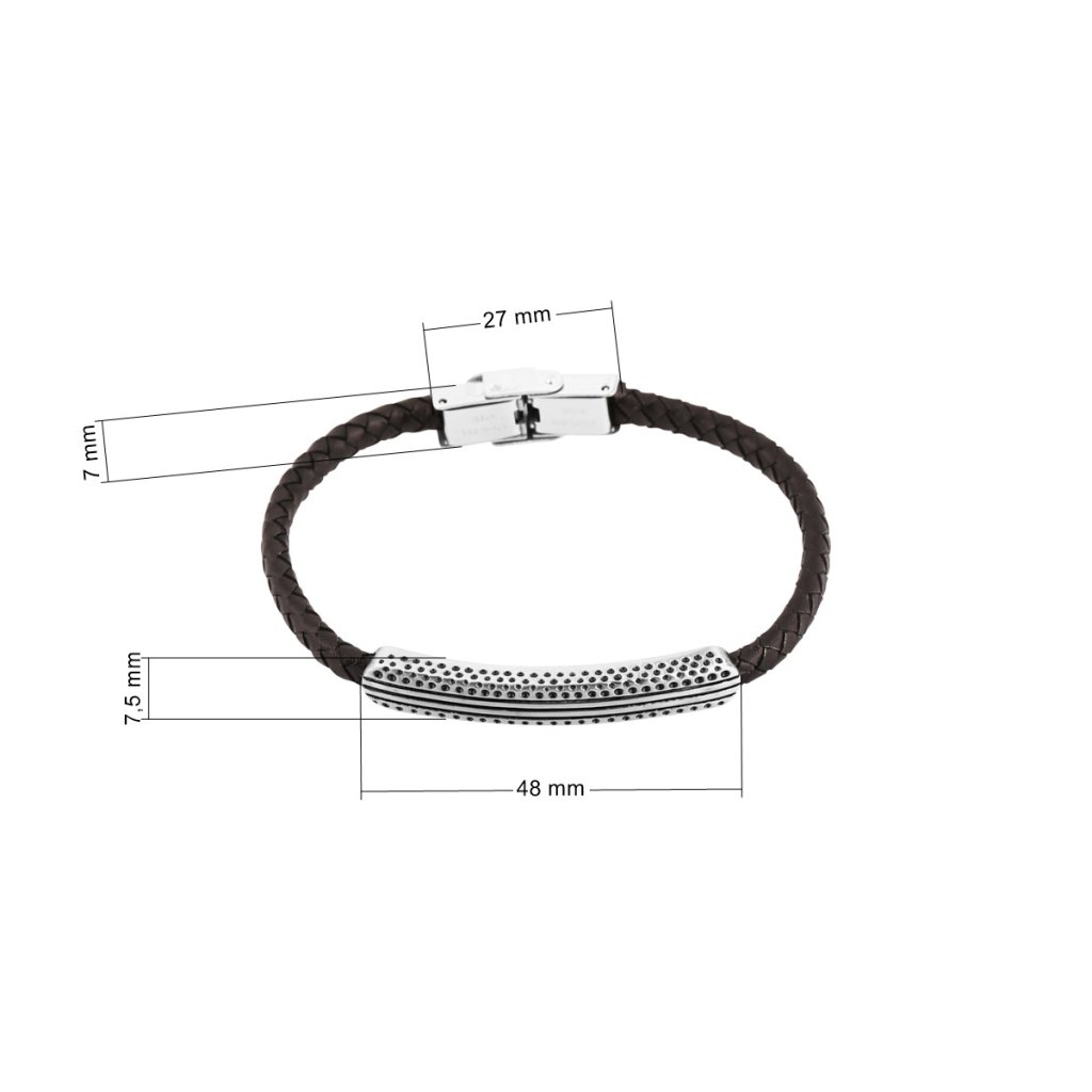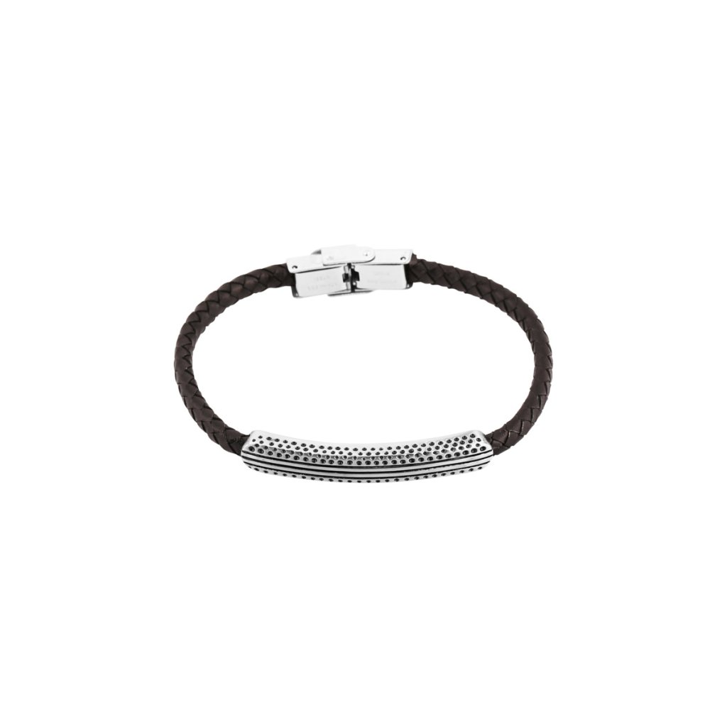 Náramek je vhodným dárkem pro elegantní muže a je tvořen zapleteným páskem z černé PU kůže do kulatého průřezu a ozdoben elegantním obdélníkem s ornamentem.