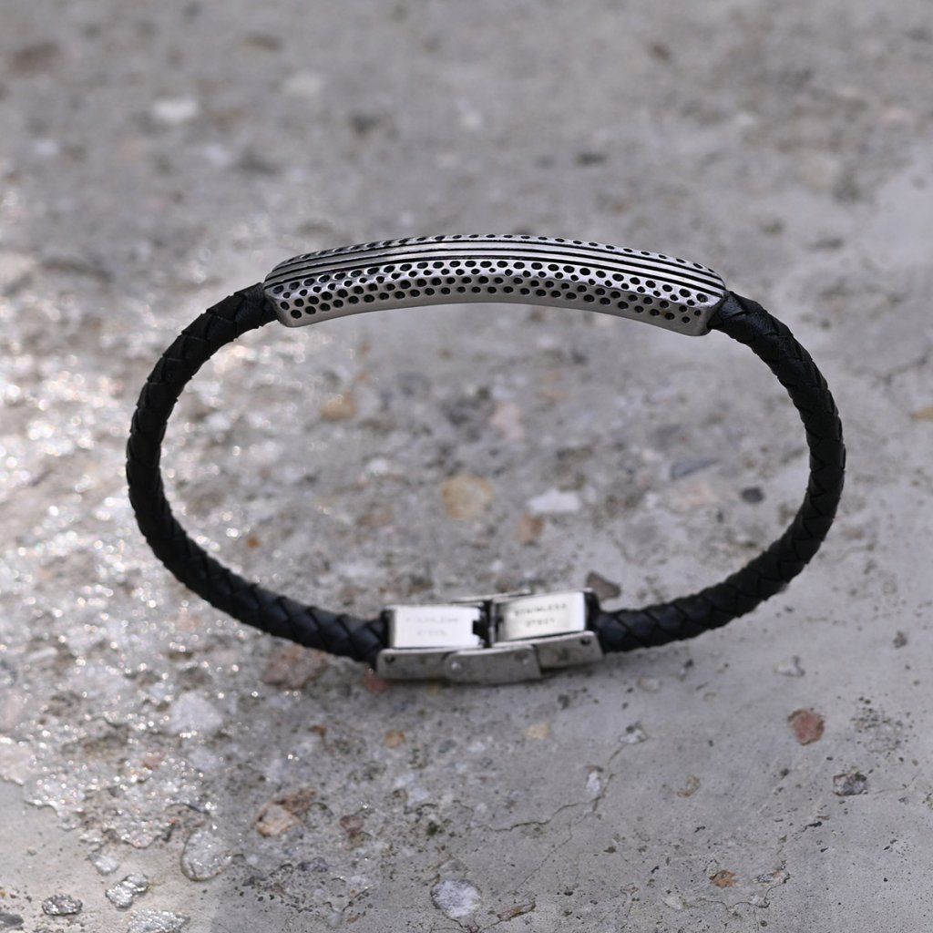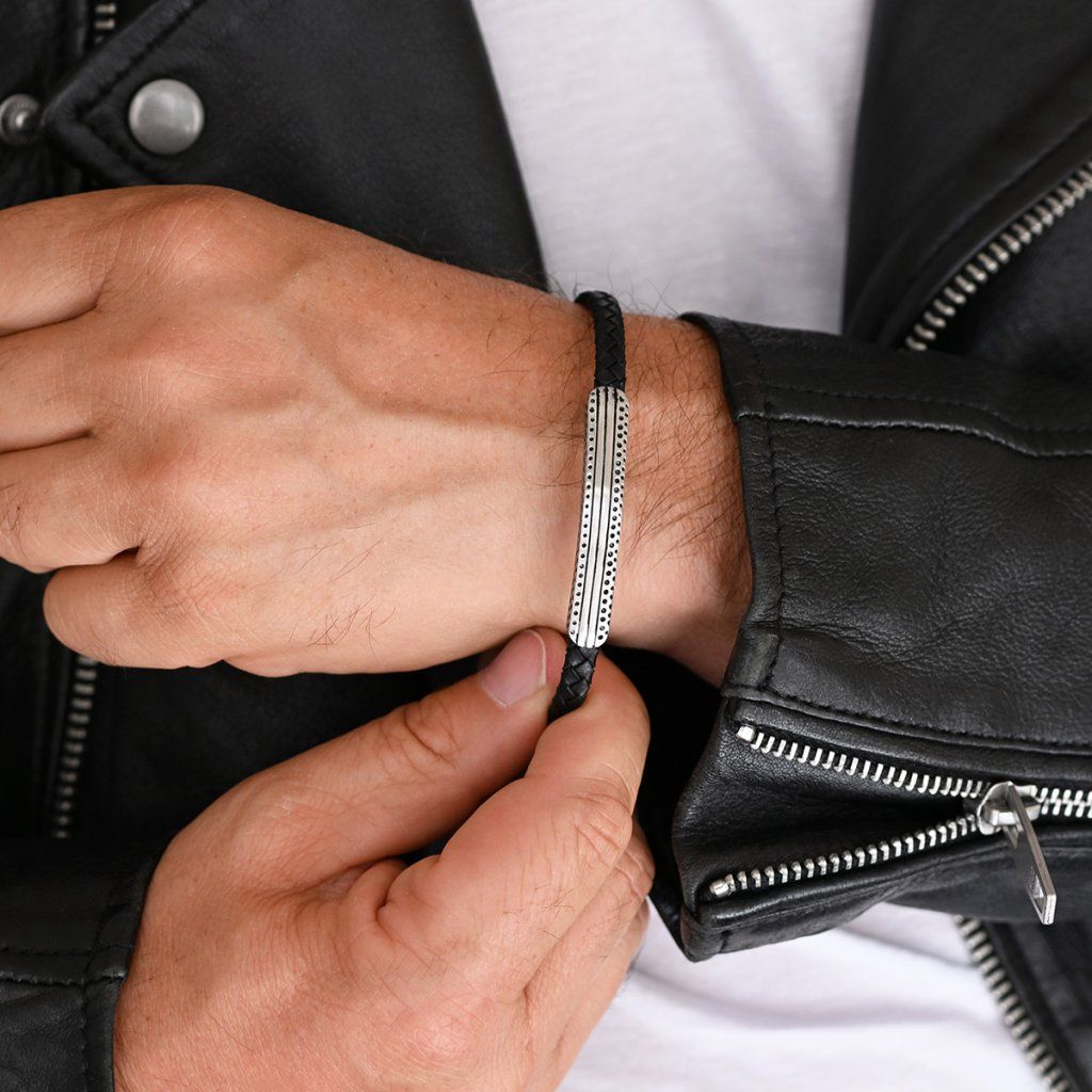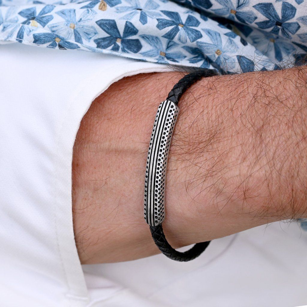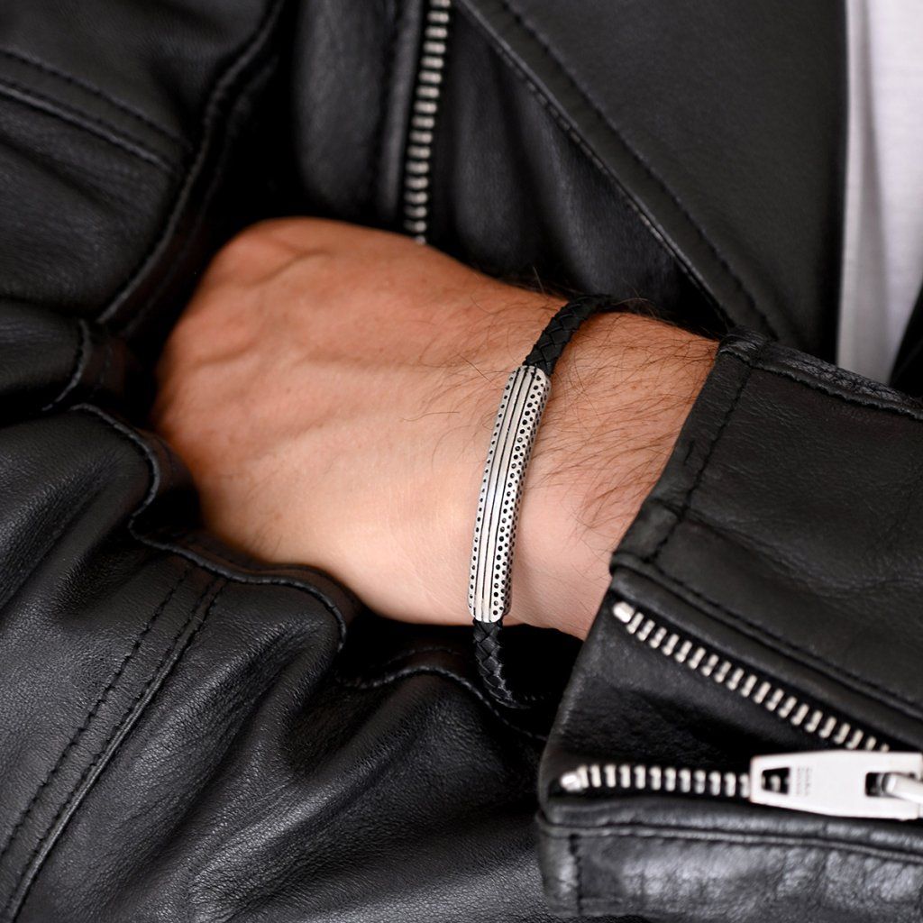 Náramek je vhodným dárkem pro elegantní muže a je tvořen zapleteným páskem z černé PU kůže do kulatého průřezu a ozdoben elegantním obdélníkem s ornamentem.