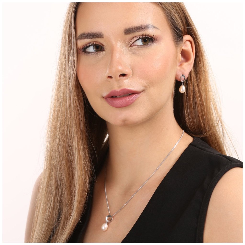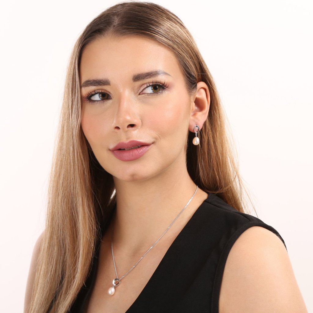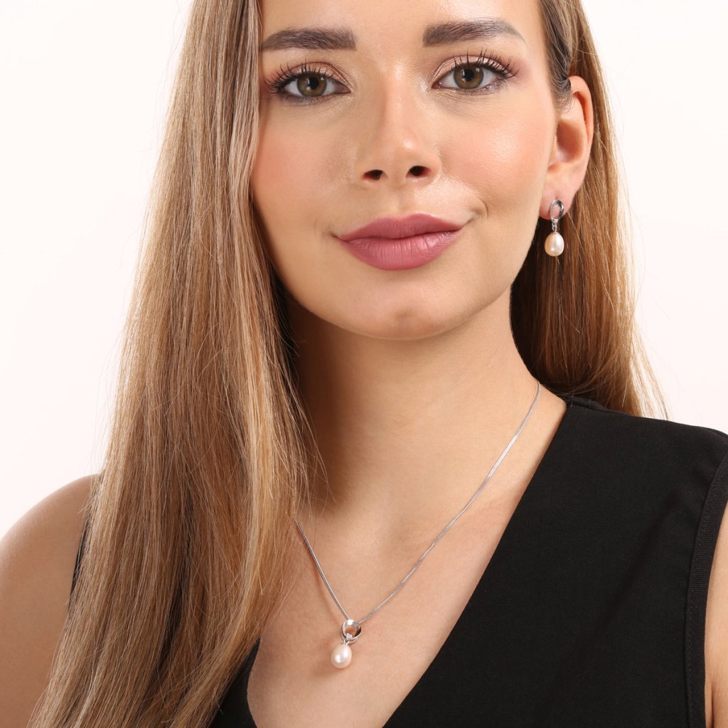 Ta obsahuje visací náušnice s bílými oválnými perlami a náhrdelník s perlovým přívěškem. Šperky jsou vyrobeny ze stříbra ryzosti 925/1000 s rhodiovanou povrchovou úpravou, jsou zdobeny bílými říčními perlami nejvyšší kvality AAA a doplněny malými blýskavými zirkony. Délka náhrdelníku je 45 cm a visací náušnice jsou dlouhé 23 mm. Náhrdelník ani náušnice neobsahují nikl, a tak je bez obav mohou nosit i alergici. Náušnice ze soupravy zapnete na puzetu, která je ochrání proti nechtěné ztrátě.