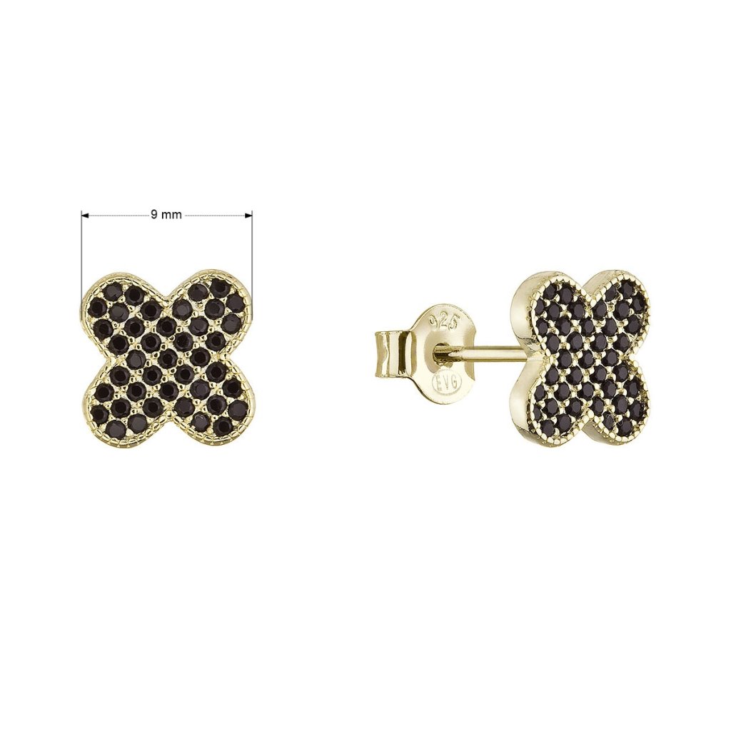 Náušnice jsou vyrobeny z pozlaceného stříbra ryzosti 925/1000, které zaručuje kvalitu a trvalý lesk. Originální design s jemně tvarovaným ozdobným okrajem dodává těmto náušnicím neopakovatelný charakter. Každý lísteček čtyřlístku je precizně osázen drobnými černými zirkony, které při sebemenším pohybu rozehrávají nádhernou hru světla.