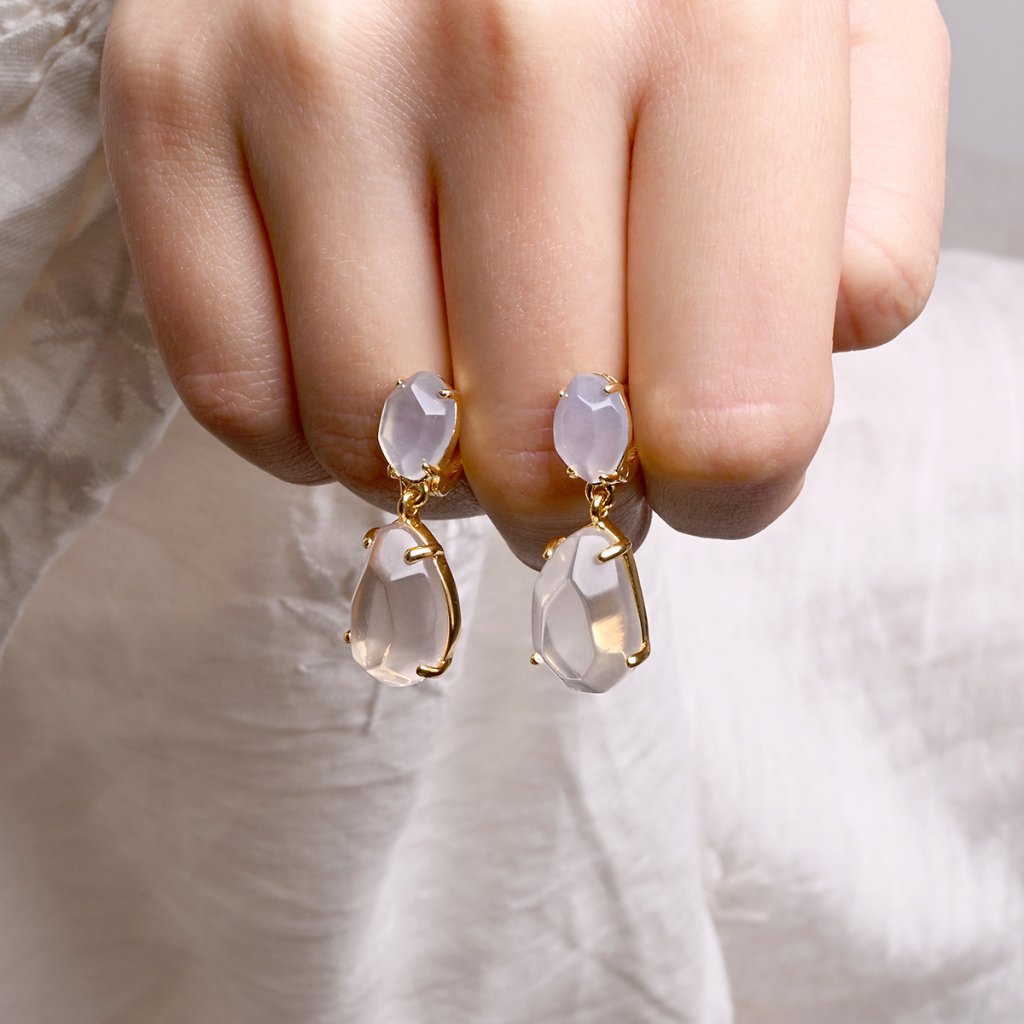 Náušnice jsou vyrobeny z pozlaceného stříbra nejvyšší kvality ryzosti 925/1000. Šperk zdobí dva vzácné kameny v nádherném, téměř sochařském provedení - větší, něžně růžový růženín a menší, jemně modrošedý chalcedon. Jejich vertikální uspořádání vytváří dynamickou kompozici plnou kontrastu a harmonie. Pozlacený povrch dodává náušnicím teplý, jemný lesk, který dokonale rozzařuje krásu kamenů. Pohodlné zapínání na ruský patent zaručuje spolehlivé a bezpečné nošení.