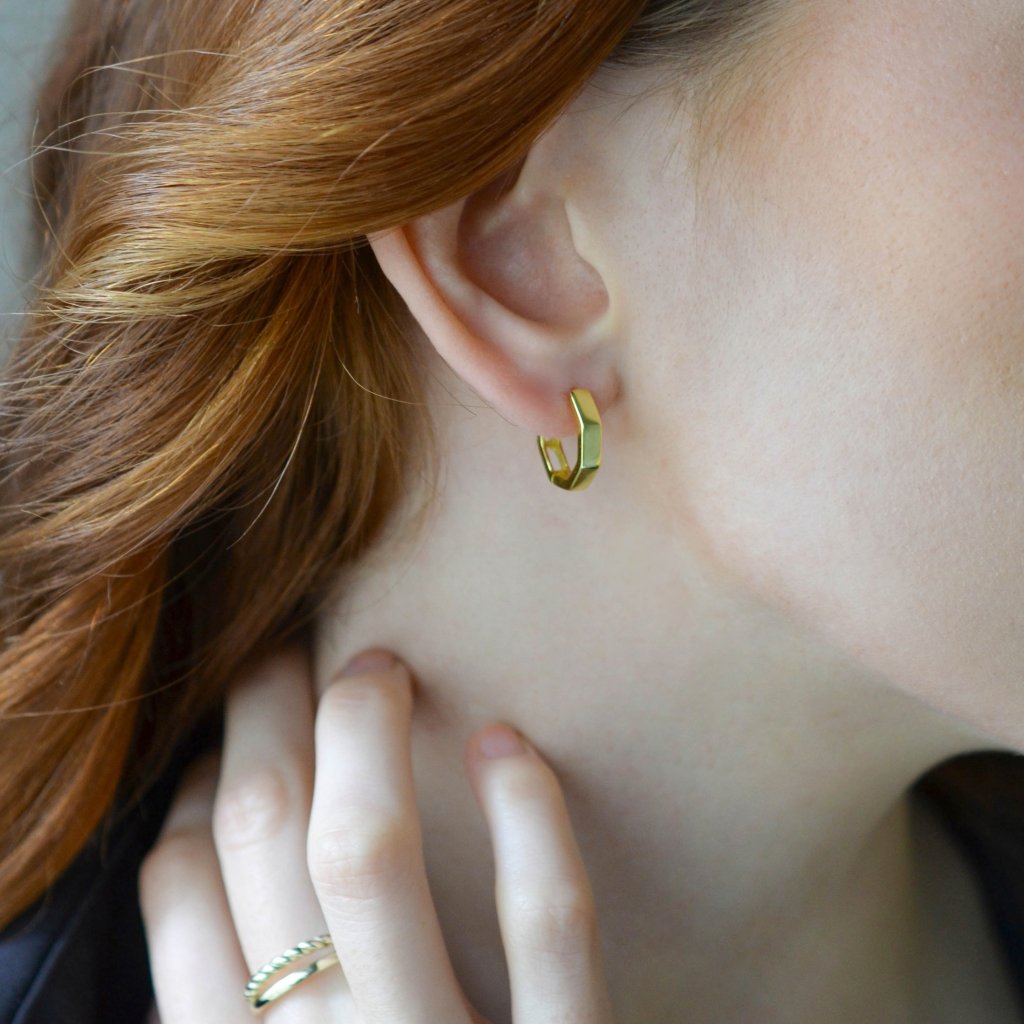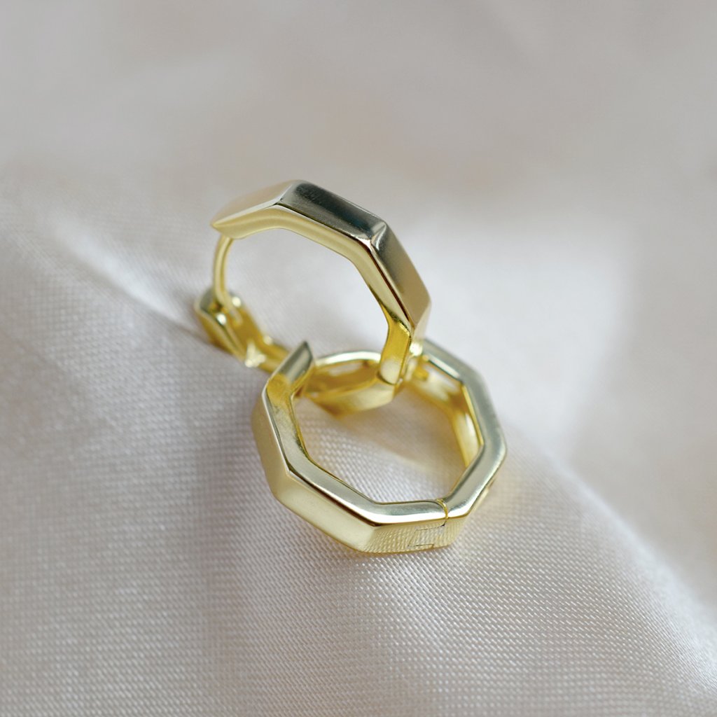 Tyto pozlacené kruhové náušnice vás zaujmou na první pohled svým neobvyklým tvarem. Nejde o klasické kulaté kruhy – jejich design je jemně hranatý, zaoblený do měkkých linií, které dodávají moderní a sofistikovaný vzhled. Hladký povrch bez zdobení nechává vyniknout tvar i lesk kovu.