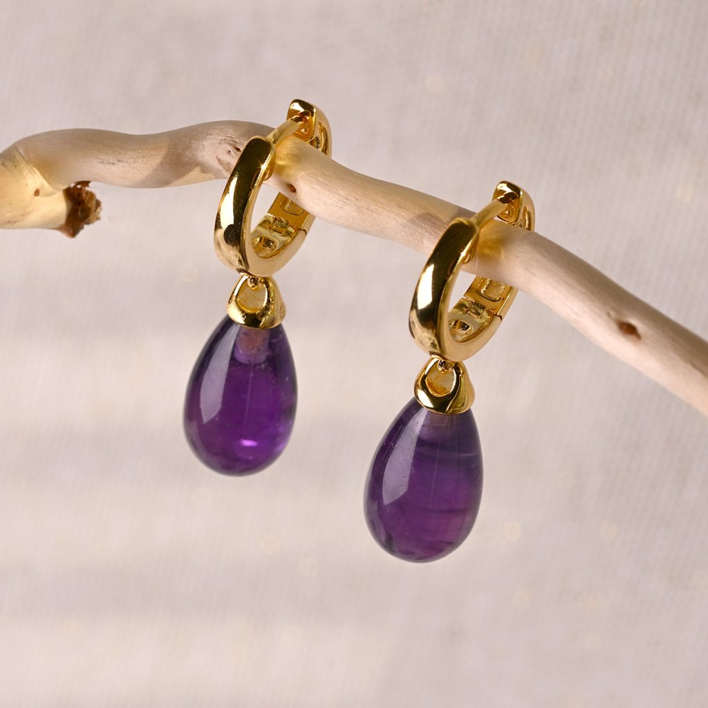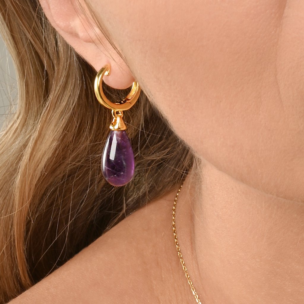Náušnice jsou vyrobeny ze stříbra ryzosti 925/1000 s jemným pozlaceným povrchem, který dodává šperku luxusní a teplý lesk. Jejich jedinečný design kombinuje jemnost a dynamiku - pravý fialový ametyst ve tvaru něžné kapky se při každém pohybu lehce pohupuje, čímž vytváří elegantní a živý šperk. Zapínání na kroužek zajišťuje pohodlné a spolehlivé nošení.