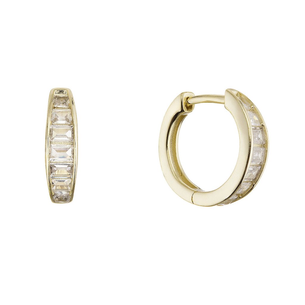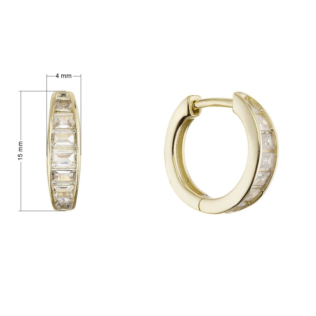 Kruhové náušnice jsou precizně zpracované ze stříbra ryzosti 925/1000 s pozlacenou povrchovou úpravou. Kruhy jsou osázeny zirkony broušenými do obdélníkového tvaru zvaného baguette. Tento elegantní brus vyniká čistými liniemi a krásně odráží světlo, takže náušnice působí luxusně. Zapínání na kroužek zajistí pohodlné a spolehlivé nošení.