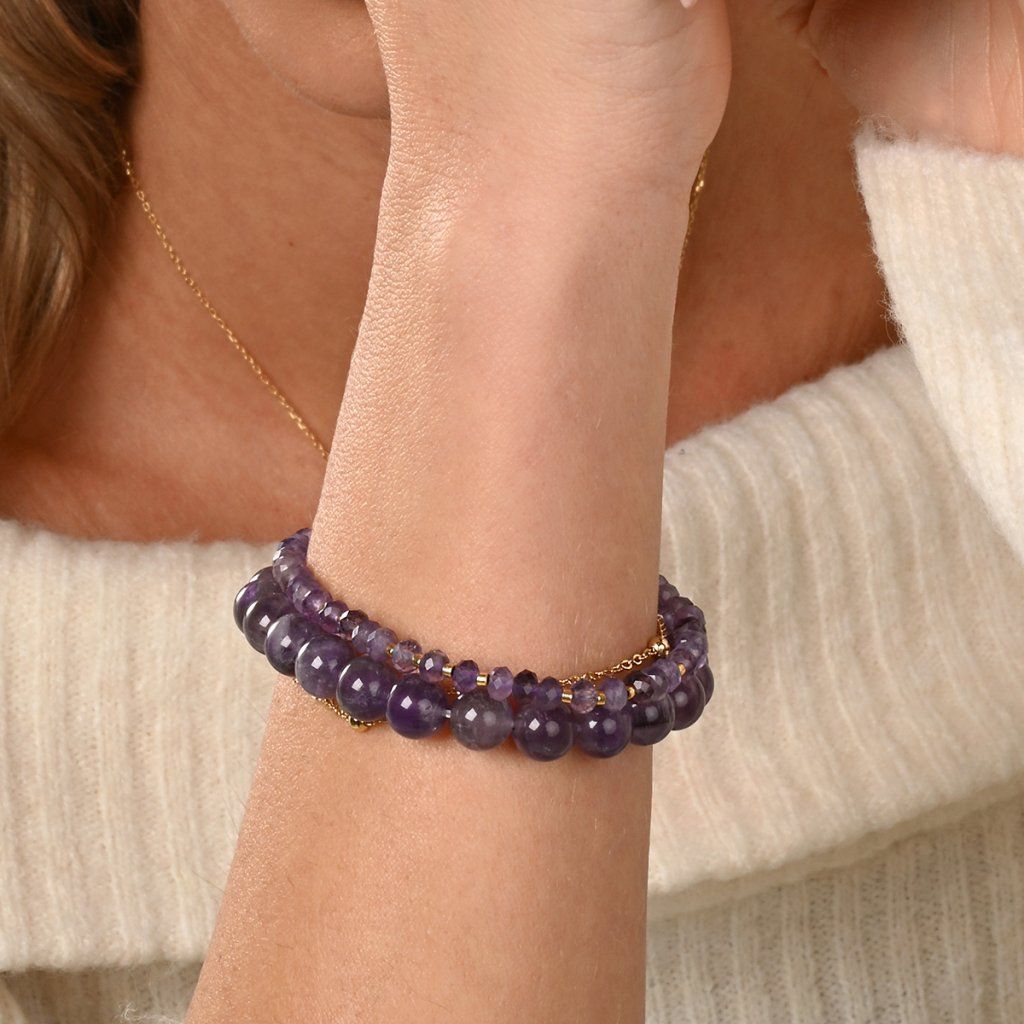 Tento jemný dvojitý náramek spojuje elegantní pozlacený stříbrný řetízek s linií korálků z pravých ametystů v krásných fialových tónech. Ametyst je ceněný pro svůj harmonizující vzhled a sytou, avšak jemnou barvu, která dodává šperku noblesní a svěží nádech. Pozlacené stříbro 925/1000 zaručuje teplý zlatavý lesk a zároveň dobrou odolnost vůči opotřebení. Díky karabince a prodlužovacímu řetízku lze náramek upravit ze 17 cm o další 4 cm.