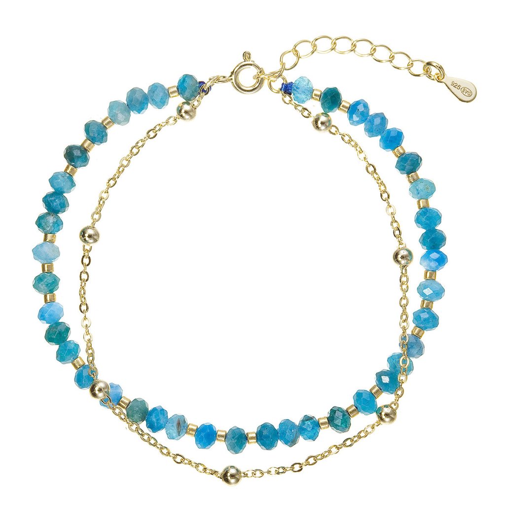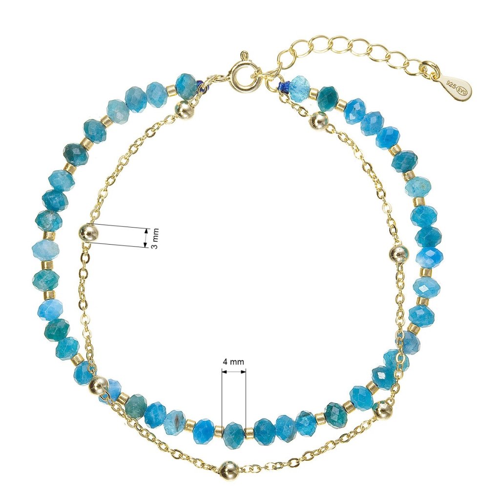 Tento jemný dvojitý náramek spojuje elegantní pozlacený stříbrný řetízek s linií korálků z pravých apatitů v hlubokých modrých až zelených odstínech. Apatit je ceněný pro svou výraznou, energizující barvu, která šperku dodává svěžest a moderní charakter. Pozlacené stříbro 925/1000 zajišťuje teplý zlatavý lesk a zároveň dobrou odolnost vůči opotřebení. Díky karabince a prodlužovacímu řetízku lze náramek pohodlně upravit ze 17 cm o další 4 cm.