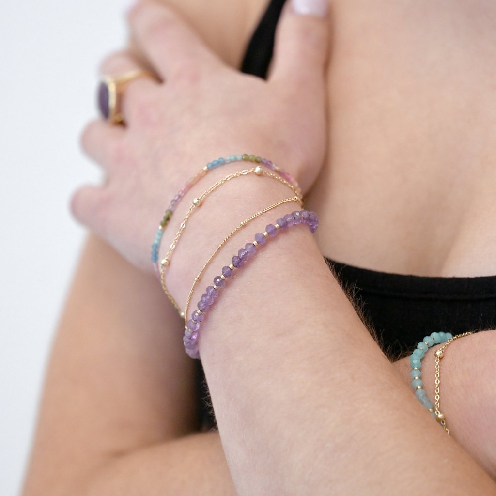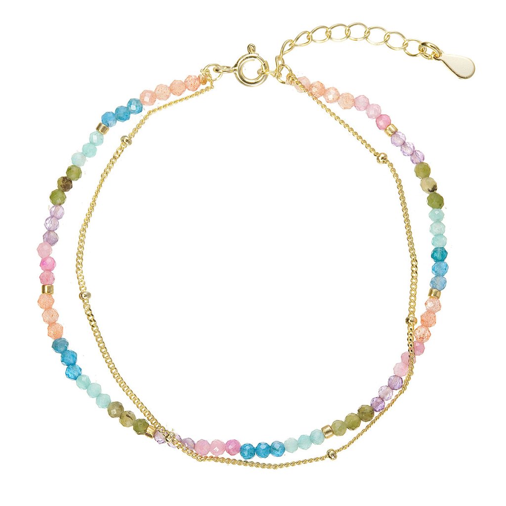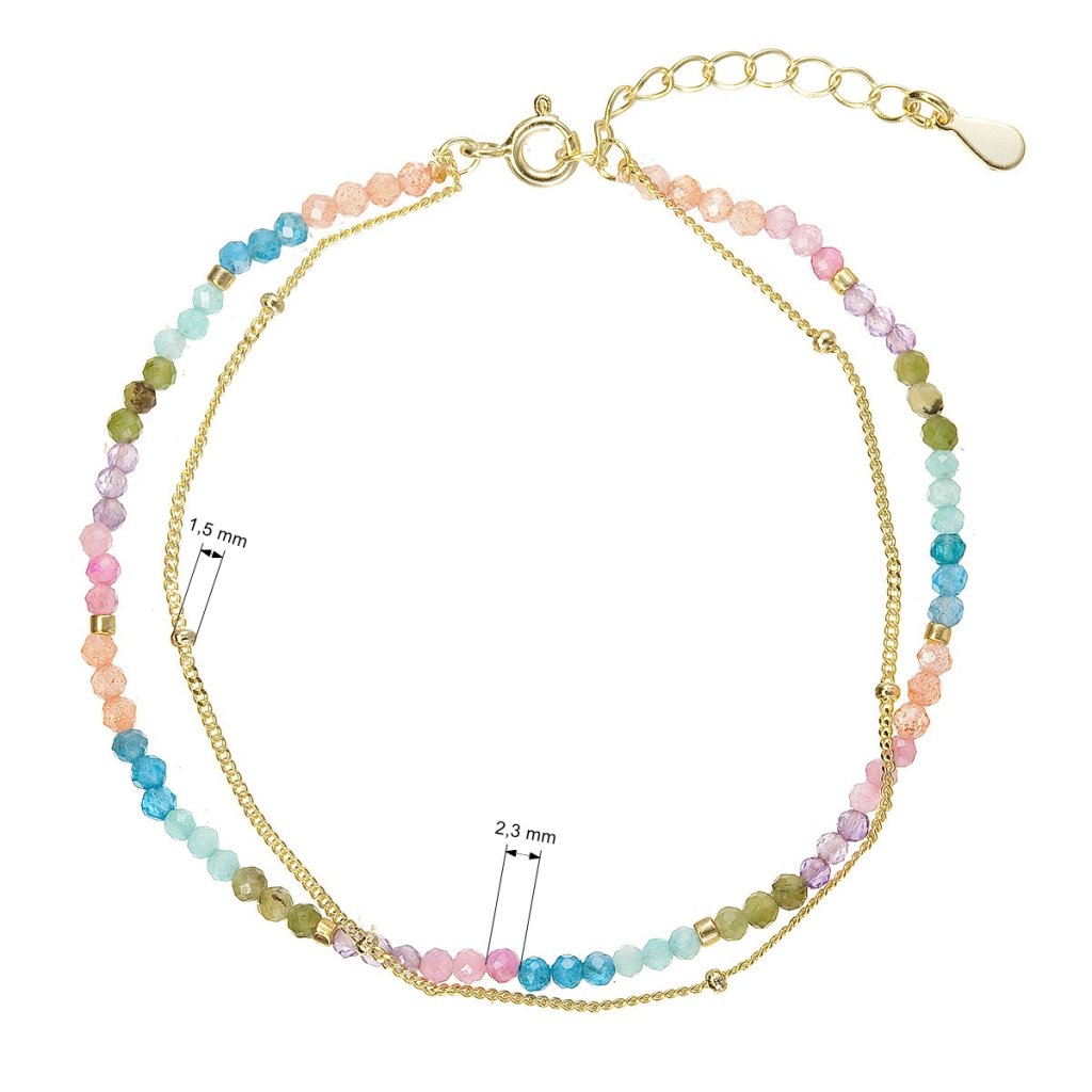 Tento stylový dvojitý náramek spojuje zlatavý řetízek z pozlaceného stříbra a barevný mix drobných korálků z pravých kamenů – od růžových a oranžových tónů přes zelené až po modré. Kontrast teplého zlata s živou paletou minerálů vytváří výrazný, moderní a radostný design.