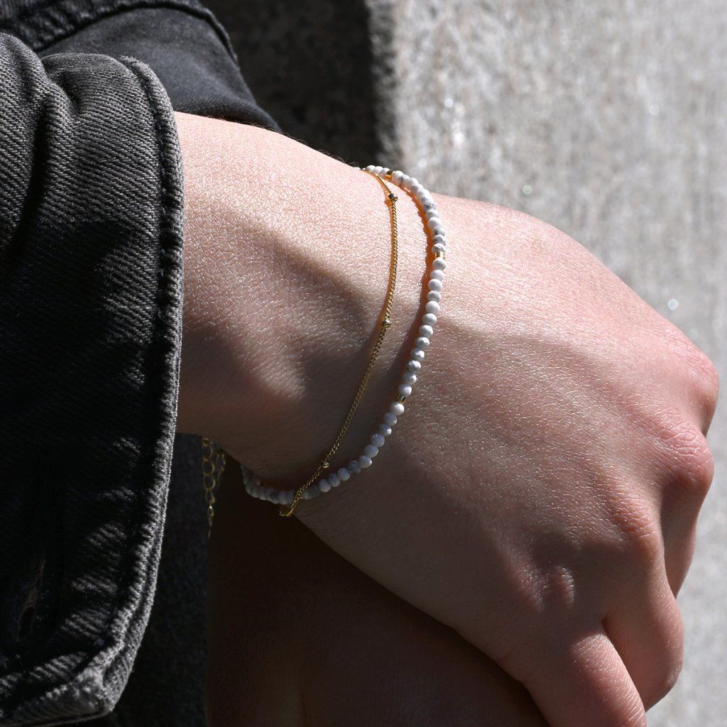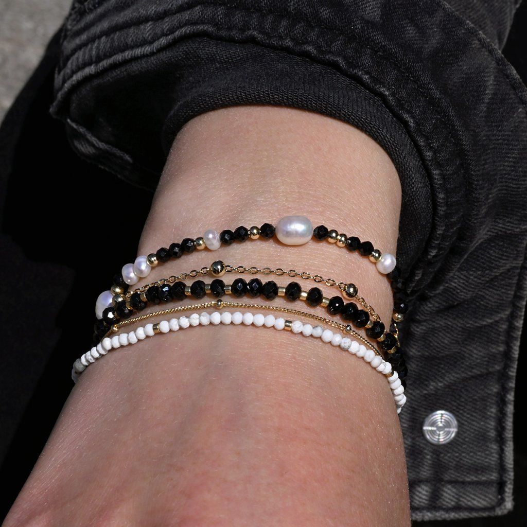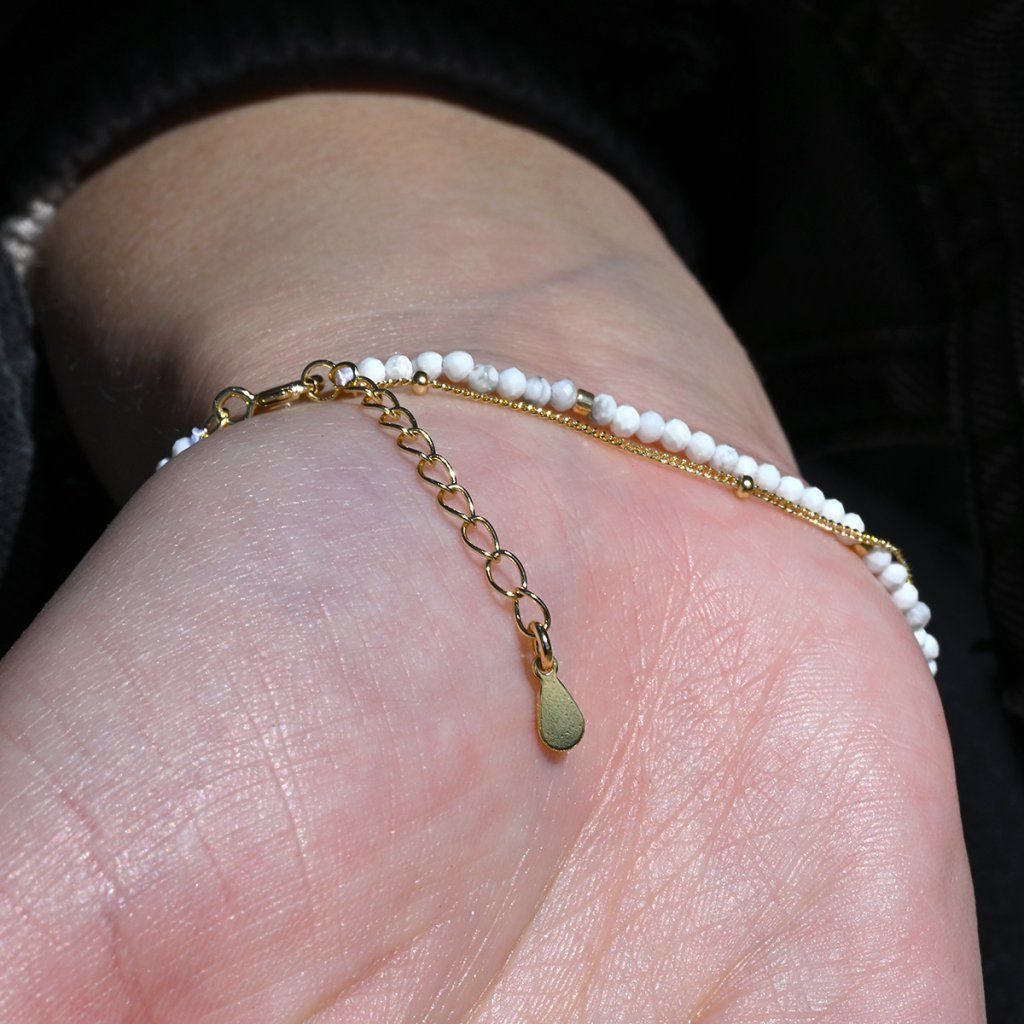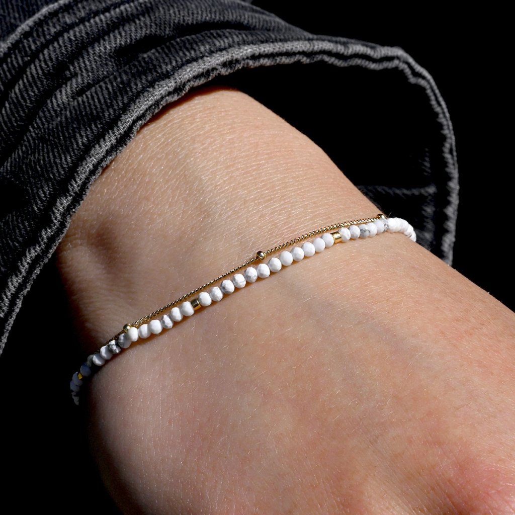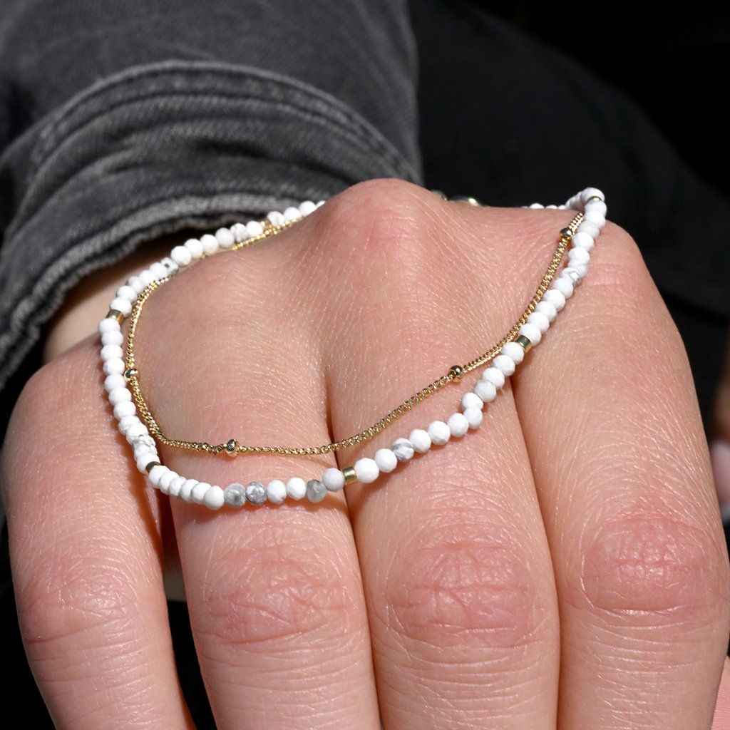 Tento hravý a elegantní dvojitý náramek spojuje jemný pozlacený stříbrný řetízek s linií drobných korálků z pravých přírodních bílých howlitů. Jejich jemná šedá kresba na bílém podkladu působí čistě, harmonicky a vytváří nadčasový, lehce minimalistický dojem, který krásně ladí s teplým zlatým odstínem kovu.
