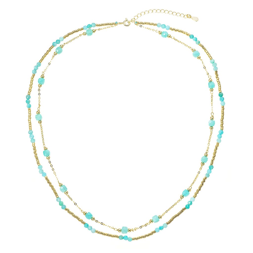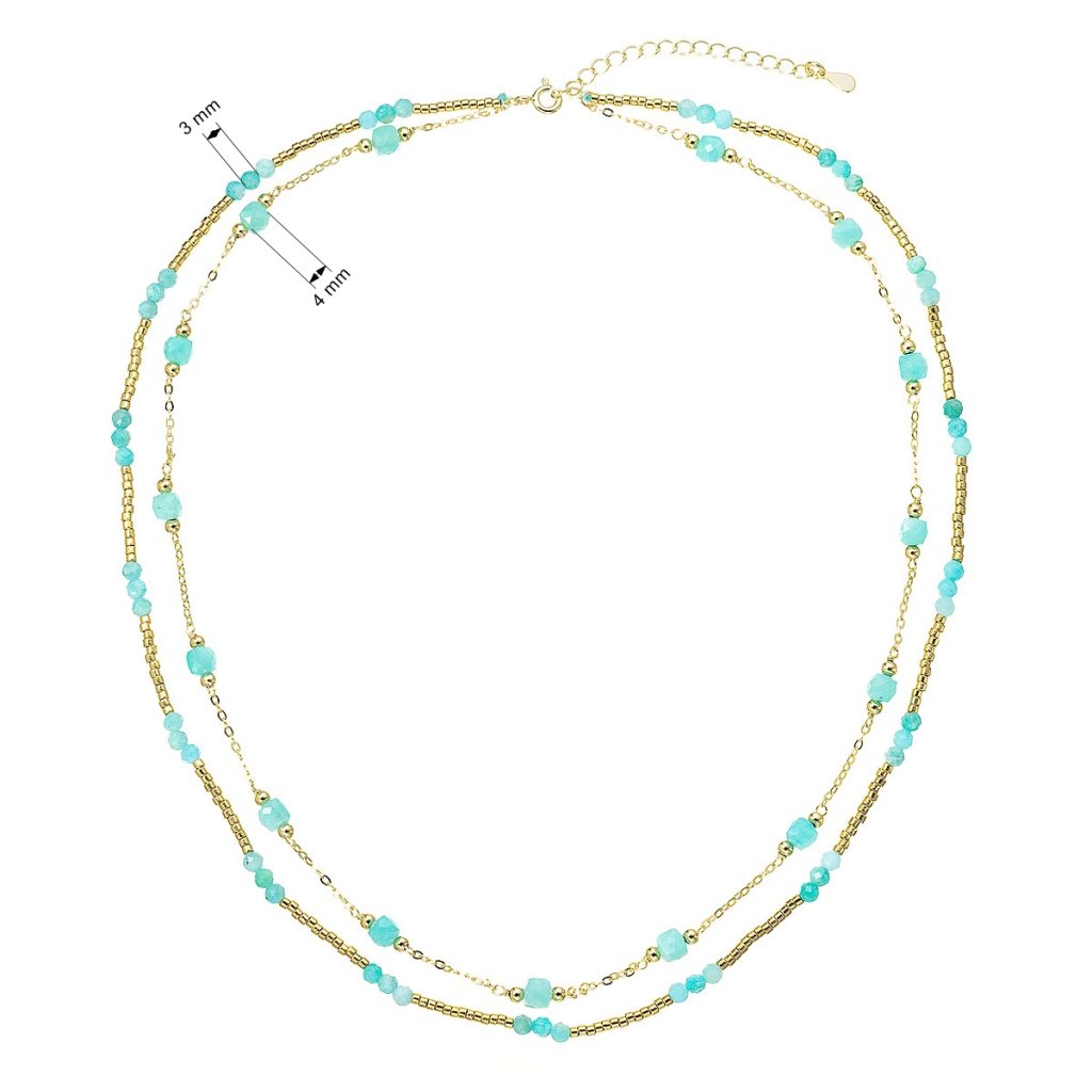 Okouzlující jemný dvouřadý náhrdelník s drobnými přírodními kamínky amazonity působí lehce a elegantně.