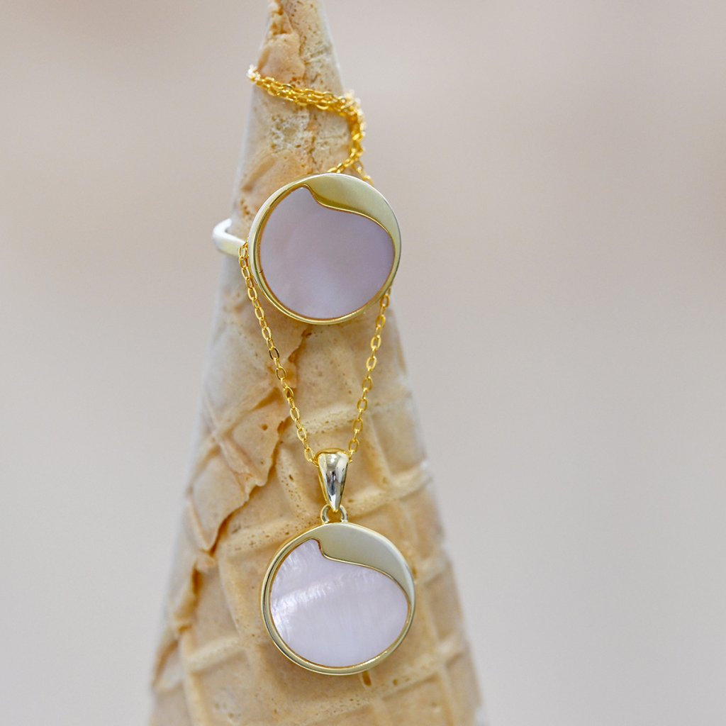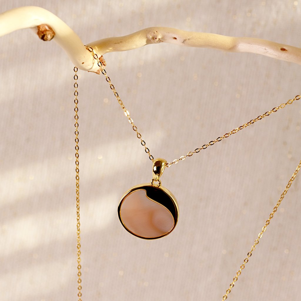 Náhrdelník s přívěskem je vyroben z pozlaceného stříbra té nejvyšší kvality 925/1000. Pozlacený povrch mu dodává teplý, jemný lesk. Kolečko zdobené pravou růžovou perletí je decentně ozvláštněno jemným stříbrným výkrojem, který dodává šperku jedinečný charakter.
