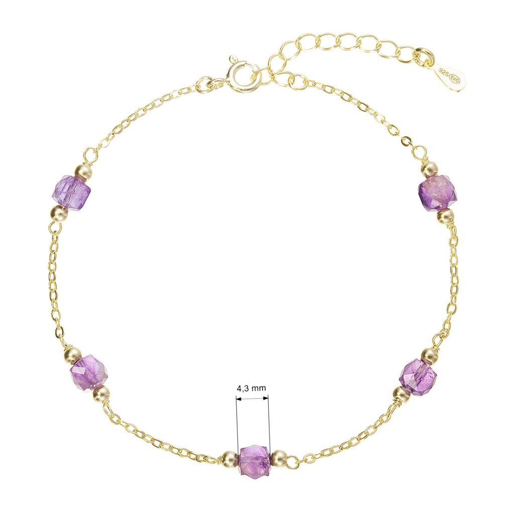 Decentní řetízek působí elegantně, ideální pro každodenní nošení i jako doplněk k večerním outfitům. Náramek je vyroben ze stříbra ryzosti 925/1000 s pozlaceným povrchem. Po obvodu náramku jsou rozesety fialové ametysty. Délku náramku lze snadno upravit díky prodlužovacímu řetízku.