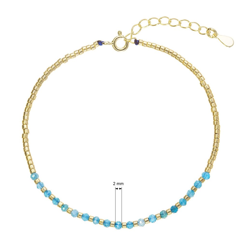 Tento jemný náramek je vyroben z pozlaceného stříbra a zdoben korálky z pravého apatitu v sytě modré barvě. Skládá se z drobných zlatých korálků, které tvoří většinu náramku, a z části z drobných modrých kamínků apatitu, které mu dodávají živý a svěží vzhled.