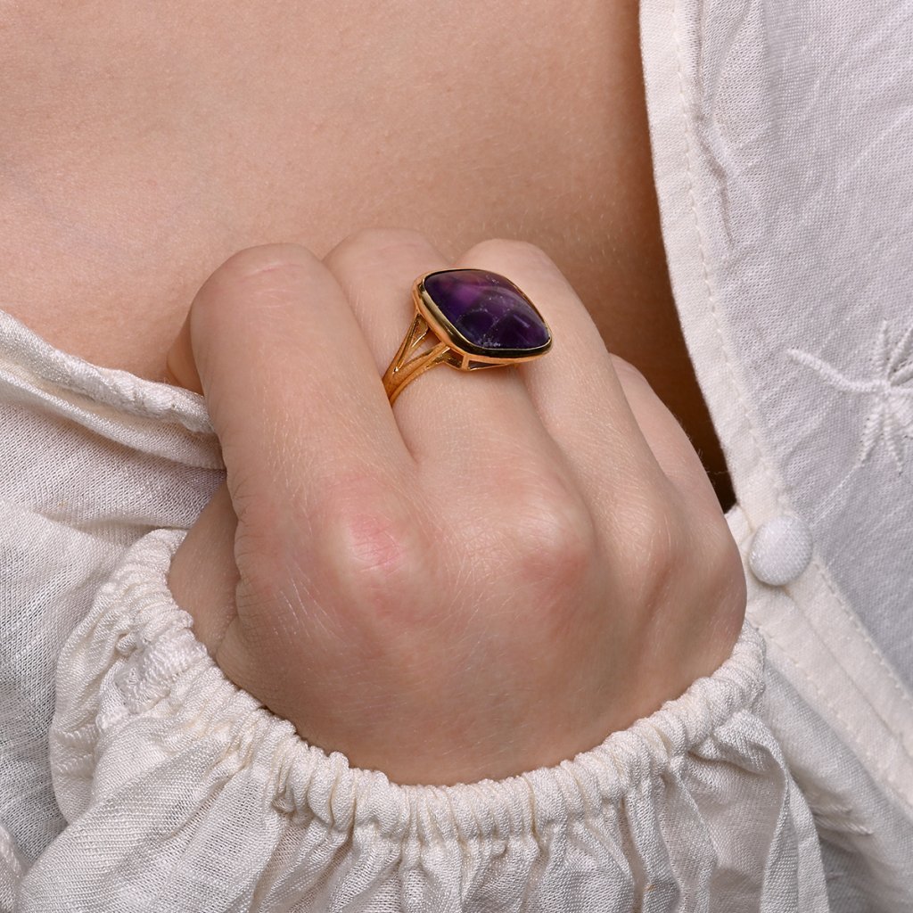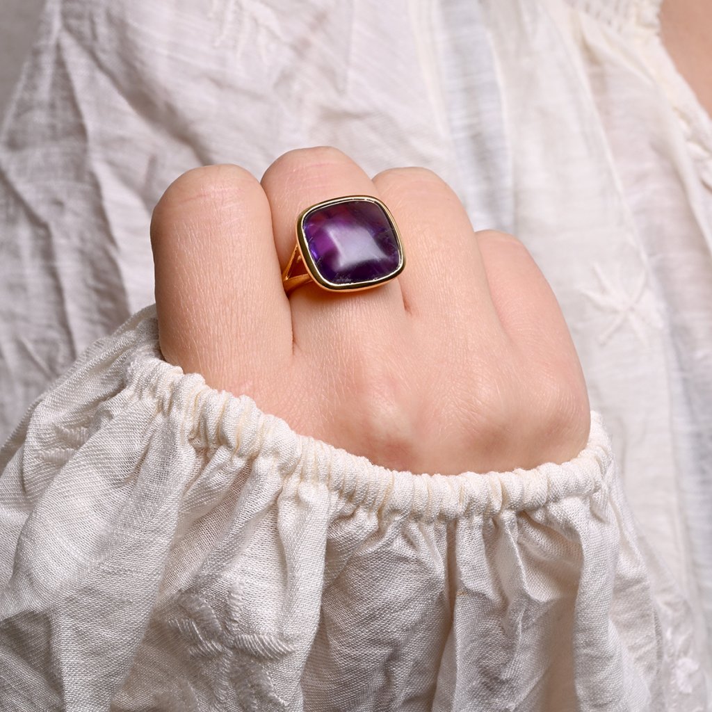Prsten je vyroben z pozlaceného stříbra té nejvyšší kvality. Výrazný design čtvercového ametystu v hlubokých fialových tónech, který v sobě ukrývá energii klidu a vnitřní transformace ve zlaté obrubě. Pozlacená povrchová úprava stříbra dodává šperku teplý, elegantní tón.