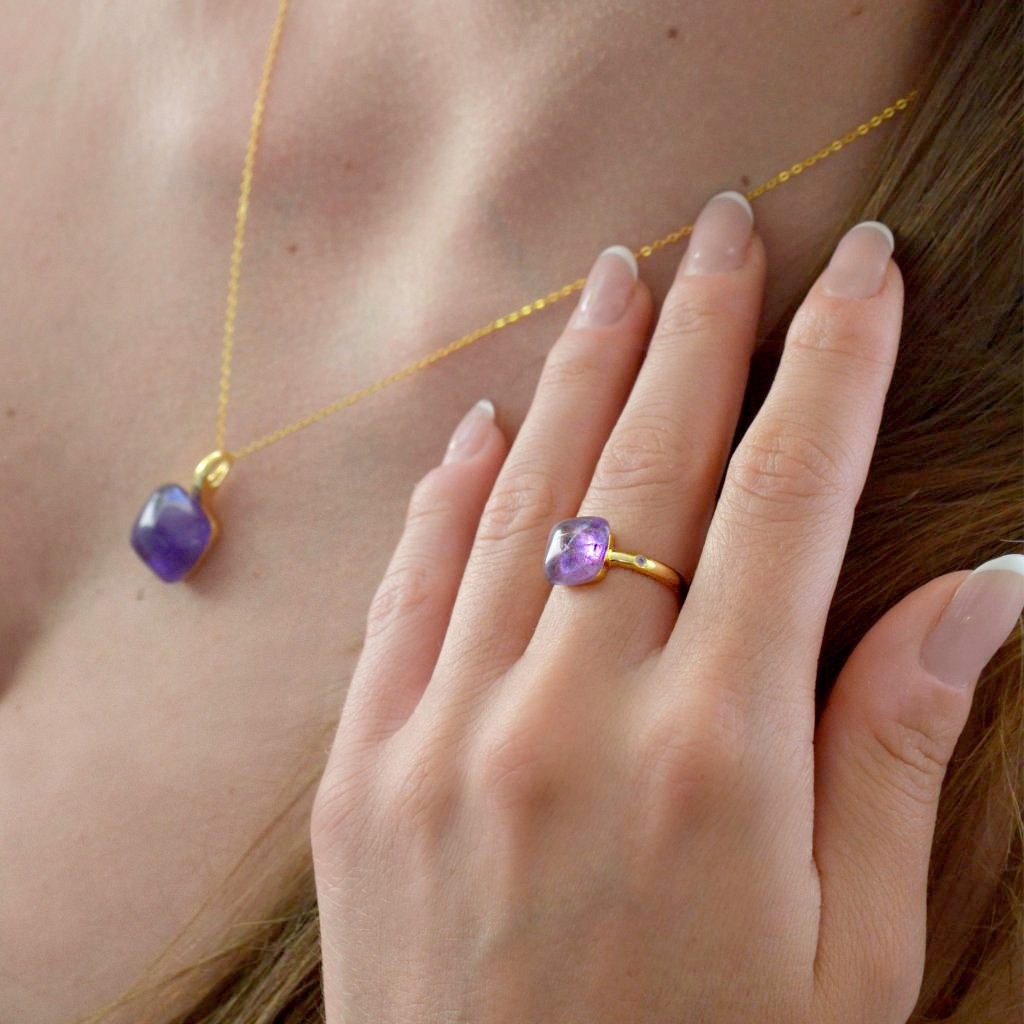 Ametyst odpradávna považovaný za kámen moudrosti a duchovního poznání, nabízí svému nositeli víc než jen krásu. Pomáhá uklidňovat mysl, podporuje meditaci a vnitřní klid. Jeho sytě fialová barva symbolizuje duchovní rozvoj, intuici a vnitřní moudrost. Ametyst je průvodcem těch, kteří hledají vnitřní harmonii, kteří chtějí prohloubit své duchovní poznání a najít vnitřní rovnováhu. Je to kámen, který pomáhá uvolňovat stres, čistit mysl a otevírat cestu k sebepoznání a vnitřnímu míru.