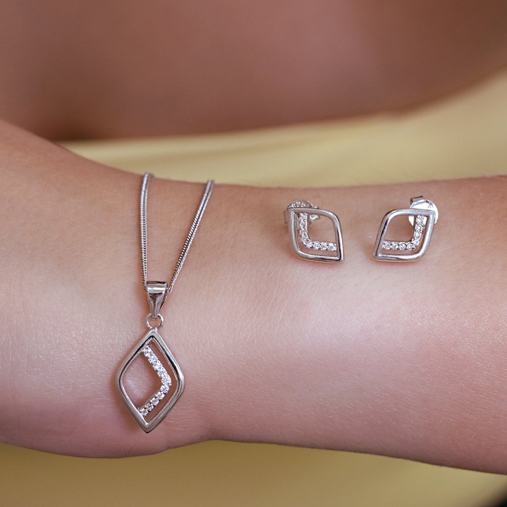 Darujte sadu stříbrných šperků k narozeninám, k Valentýnu, k Vánocům či jen tak z lásky, protože každou ženu potěší šperk.Sada šperků 19014.1 obsahuje náušnice a přívěsek v designovém tvaru připomínající lístek. Šperky jsou vyrobeny ze stříbra o ryzosti 925/1000, jehož povrch je upraven rhodiem. Rhodium chrání před zčernáním, zežloutnutím a poškrábáním šperku. Náušnice typu pecka a přívěsek zdobí ve vnitřní části proužek osázený třpytivými zirkony. Zapínání náušnic je na puzetu, ta je spolehlivou ochranou proti případné ztrátě. Šperky neobsahují nikl, a tak se nemusíte obávat žádné alergické reakce. Stříbrnou sadu šperků 19014.1 pro vás ručně vyrobily naše šikovné šperkařky v provozovně v Jablonci nad Nisou. Šperk vám dodáme v originální dárkové krabičce a taštičce spolu s pečetí kvality, kterou šperk obsahuje.