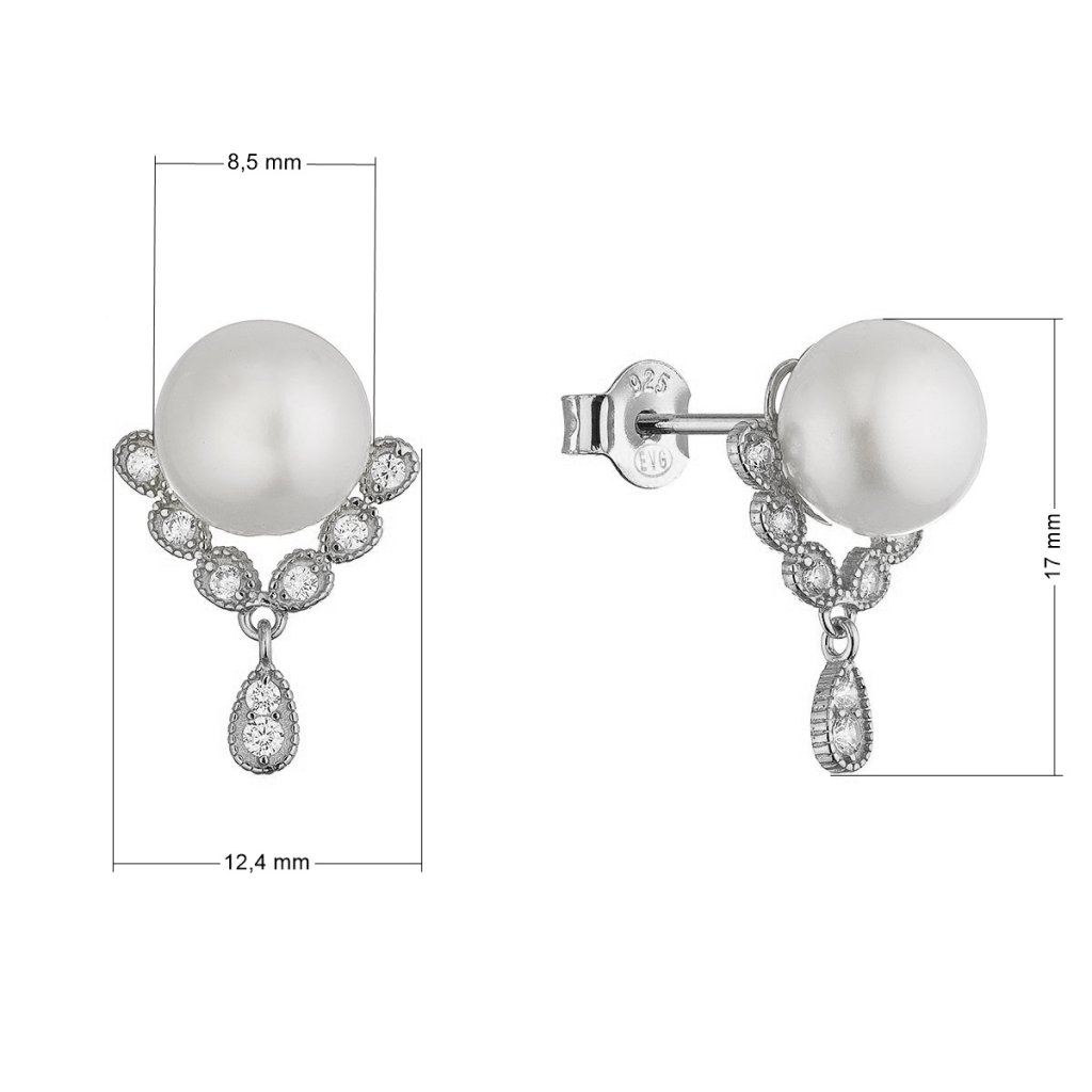 Perly kvality AA o průměru 8,5 mm dodávají šperku nadčasovou krásu. Pod perlou se nachází stříbrný trojúhelníček se zavěšenou kapičkou, zdobený zirkony, což dodává náušnicím jedinečný vzhled.