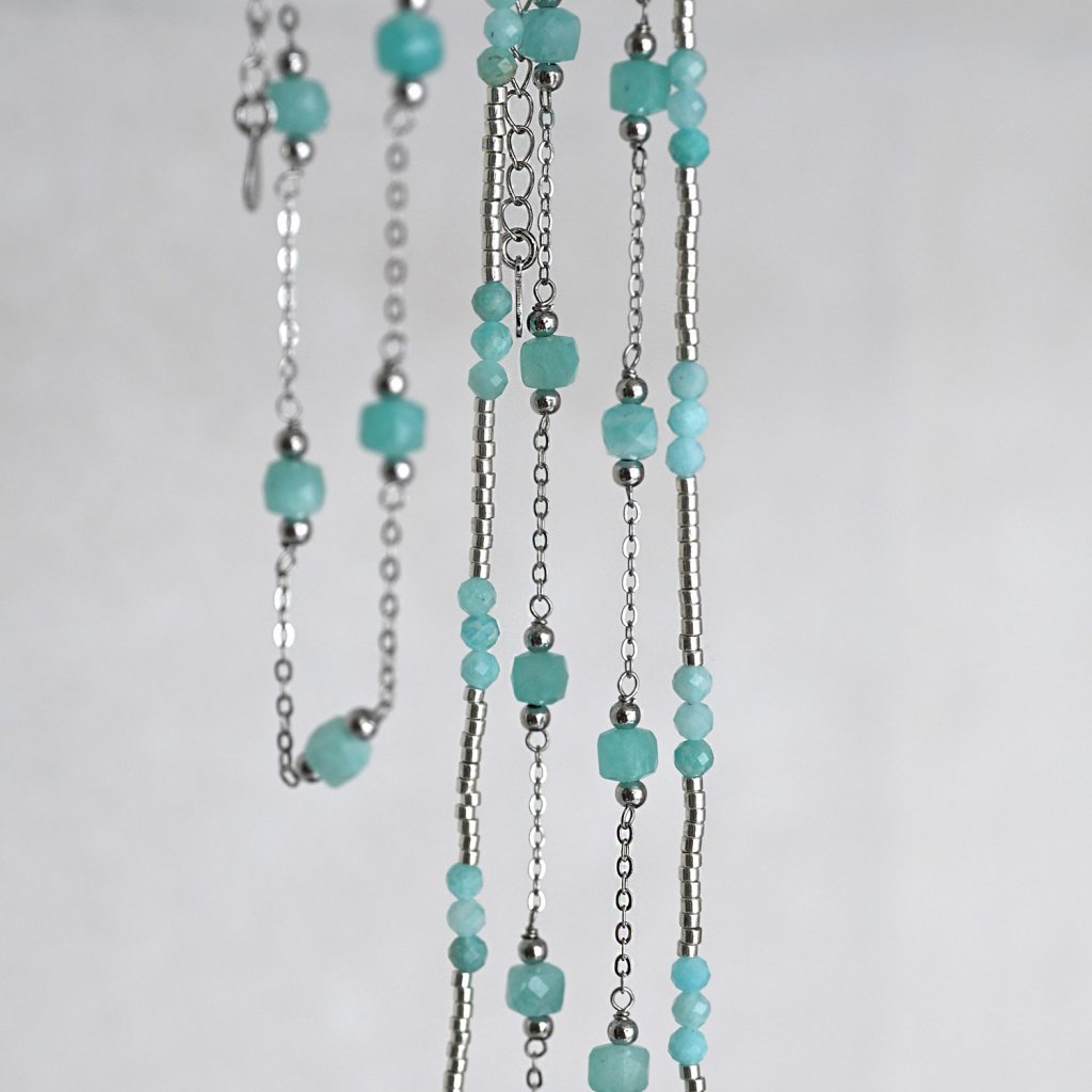 Tento jemný dvojitý náramek spojuje elegantní rhodiovaný stříbrný řetízek s linií korálků z pravých amazonitů v krásných světle tyrkysových tónech. Amazonit je ceněný pro svůj uklidňující vzhled a jemnou pastelovou barvu, která dodá šperku svěží a lehce letní nádech. Rhodiovaná úprava stříbra 925/1000 zajišťuje vysoký lesk a lepší odolnost vůči opotřebení. Díky karabince a prodlužovacímu řetízku lze náramek upravit z 17 cm o další 4 cm.