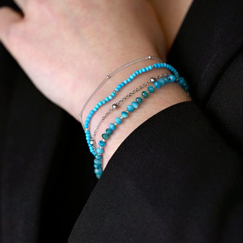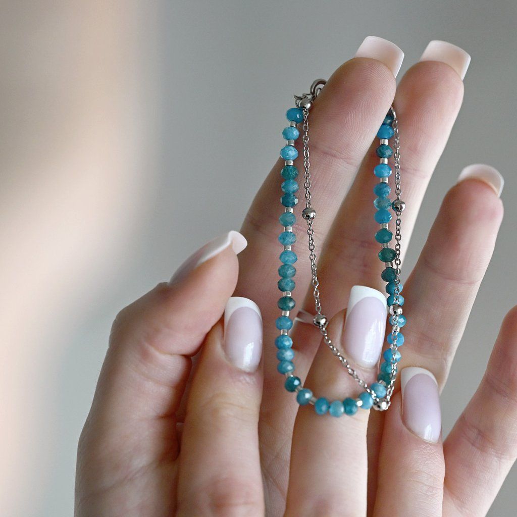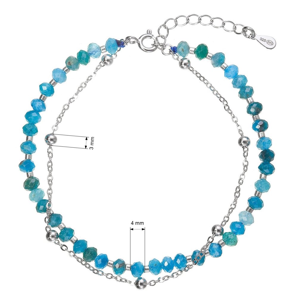 Tento jemný dvojitý náramek spojuje elegantní stříbrný řetízek s linií korálků z pravých apatitů v hlubokých modrých až zelených odstínech. Apatit je ceněný pro svou výraznou, energizující barvu, která šperku dodává svěžest a moderní charakter. Stříbro 925/1000 zajišťuje přirozený lesk a dlouhou životnost. Díky karabince a prodlužovacímu řetízku lze náramek pohodlně upravit ze 17 cm o další 4 cm.