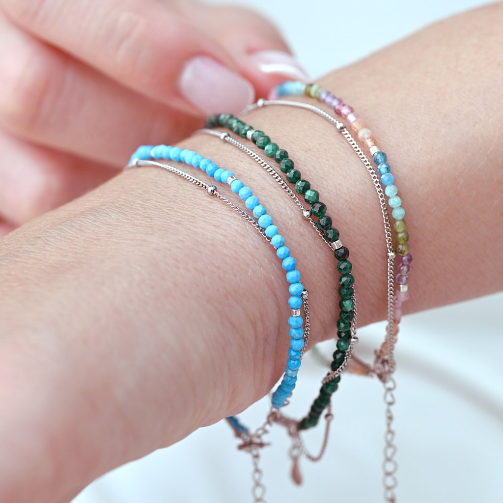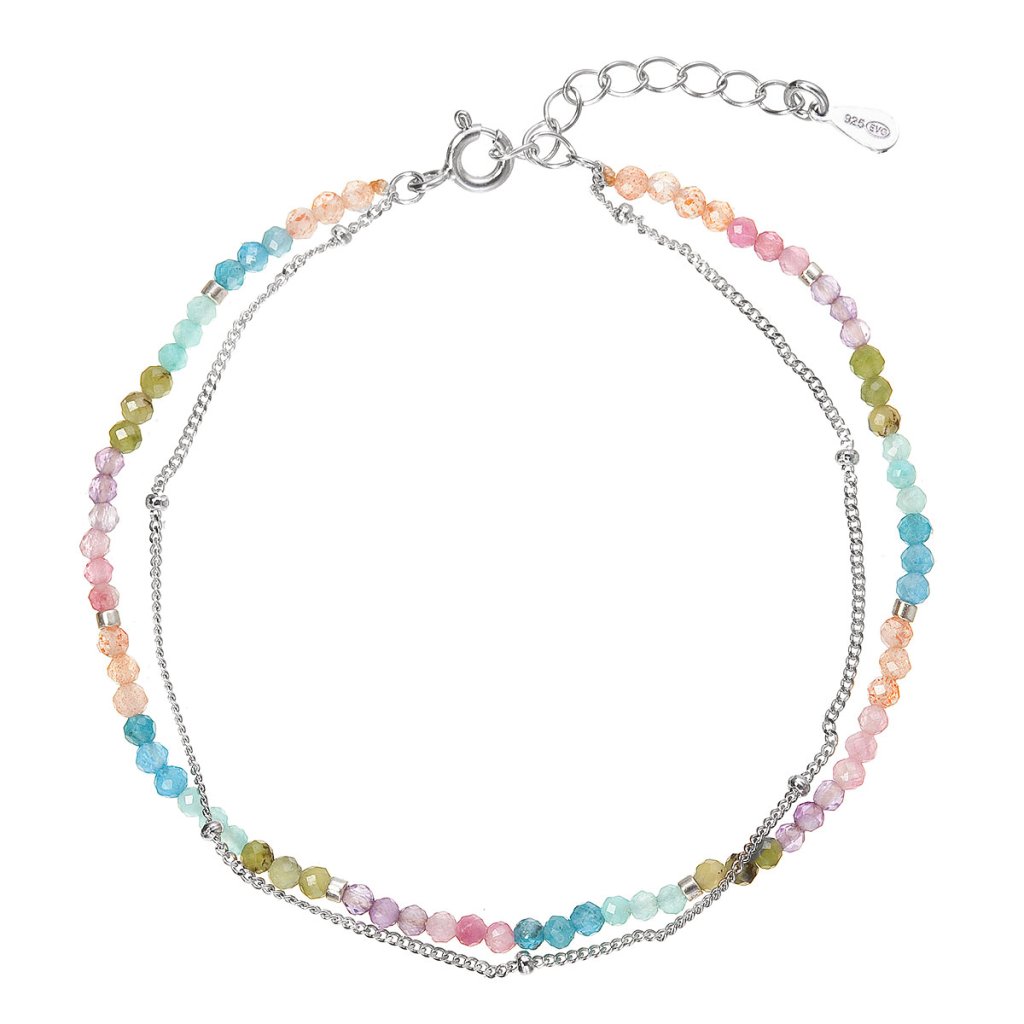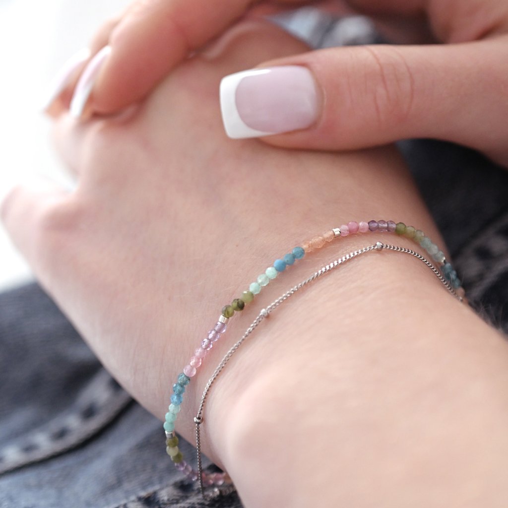 Tento hravý a elegantní dvojitý náramek kombinuje jemný rhodiovaný stříbrný řetízek s linií drobných korálků z pravých přírodních kamenů v pestré barevné paletě. Najdete mezi nimi tóny růžové, oranžové, zelené i modré – každý korálek je originál a společně vytvářejí veselý, svěží a lehce bohémský vzhled.
