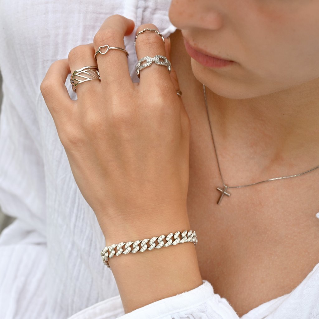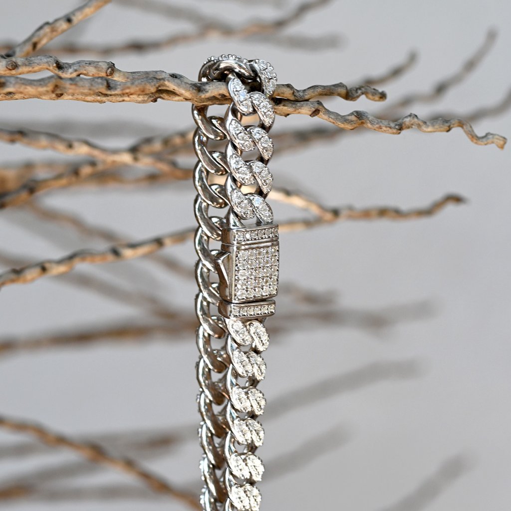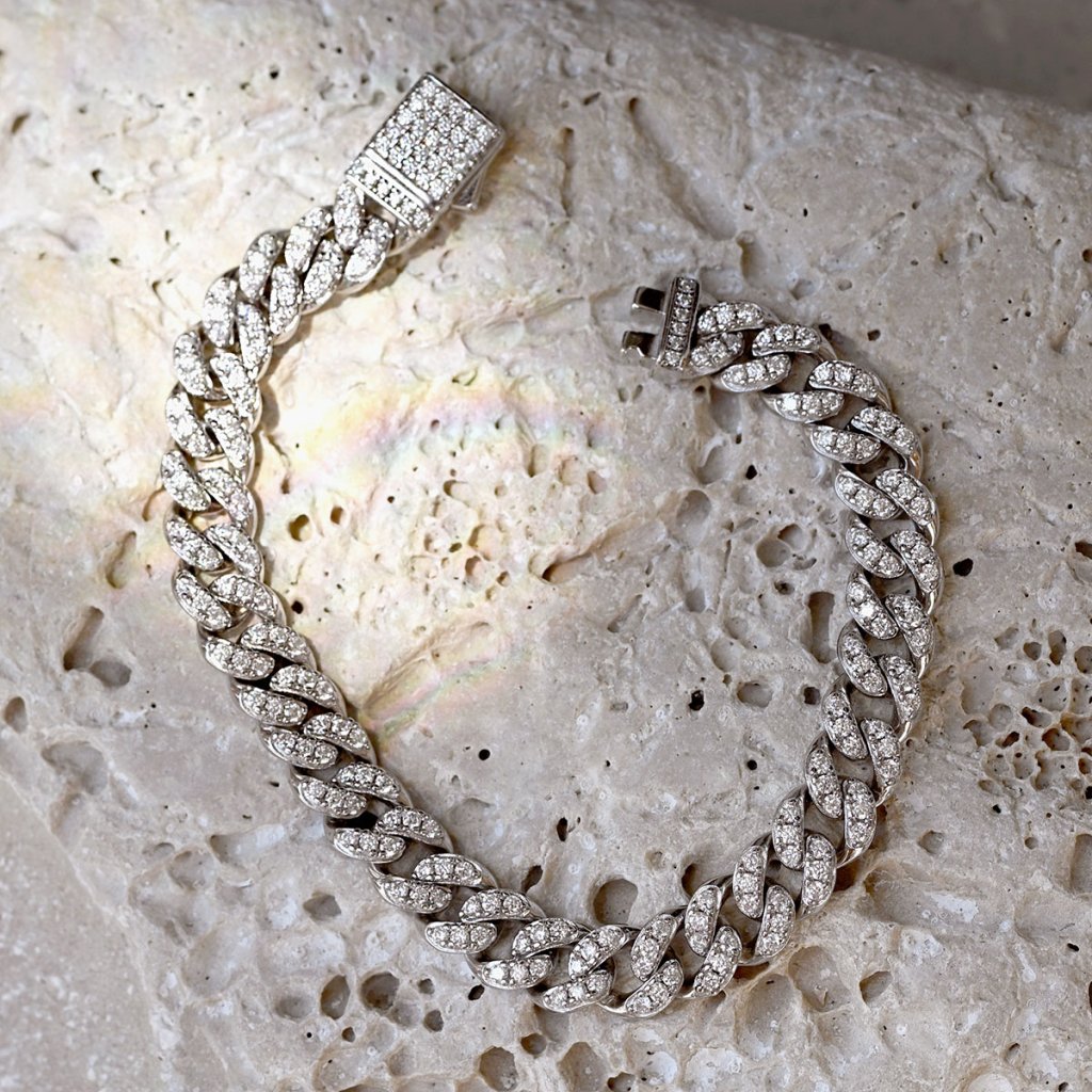 Kubánský náramek bohatě osázený třpytivými moissanite kamínky - dokonalé spojení robustní elegance a oslnivého třpytu. Každý detail tohoto šperku dýchá luxusem, od pečlivě zpracovaného stříbrného řetězu až po ozdobné zapínání, které je stejně jako zbytek náramku zdobeno jiskřivými moissanity.