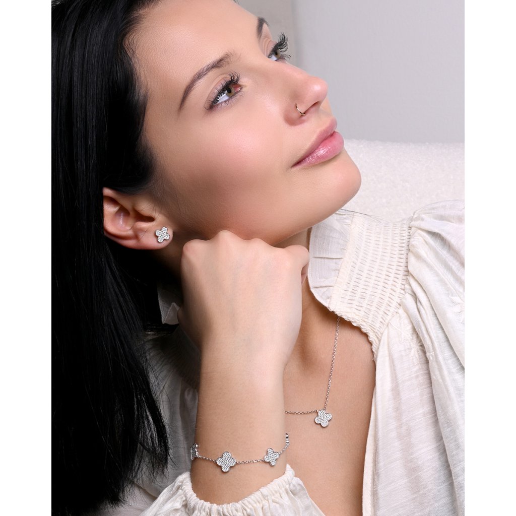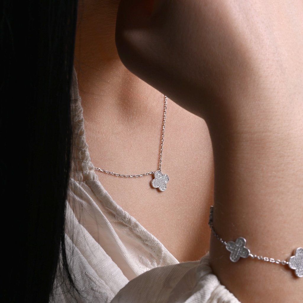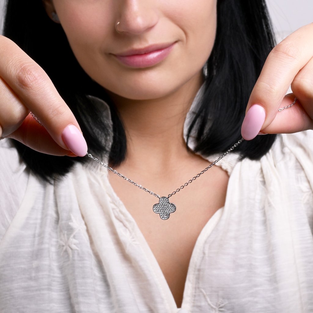 Náhrdelník je precizně zpracovaný z rhodiovaného stříbra ryzosti 925/1000, které zaručuje špičkovou kvalitu a trvalý lesk. Každý lísteček čtyřlístku je pečlivě osázen drobnými zirkony, které při sebemenším pohybu rozehrávají nádhernou hru světla.