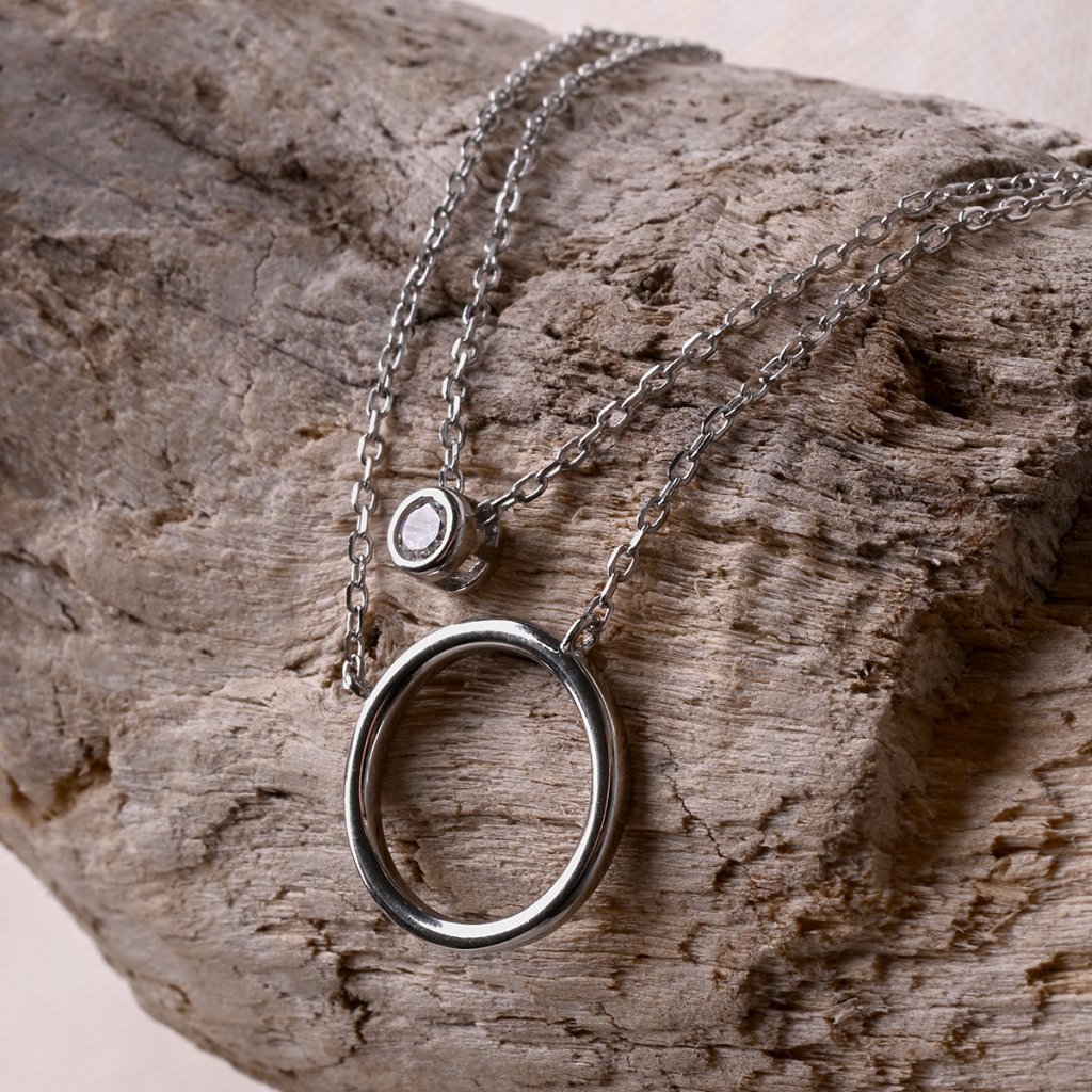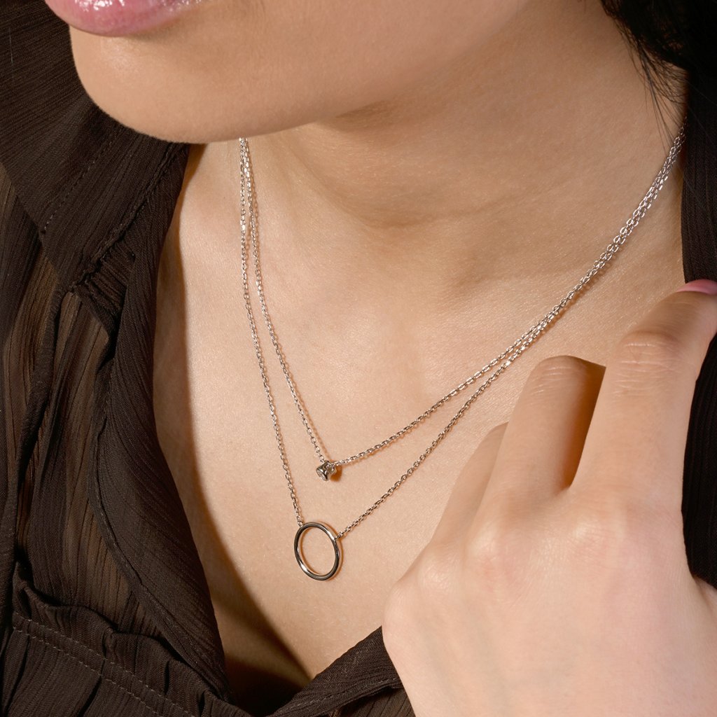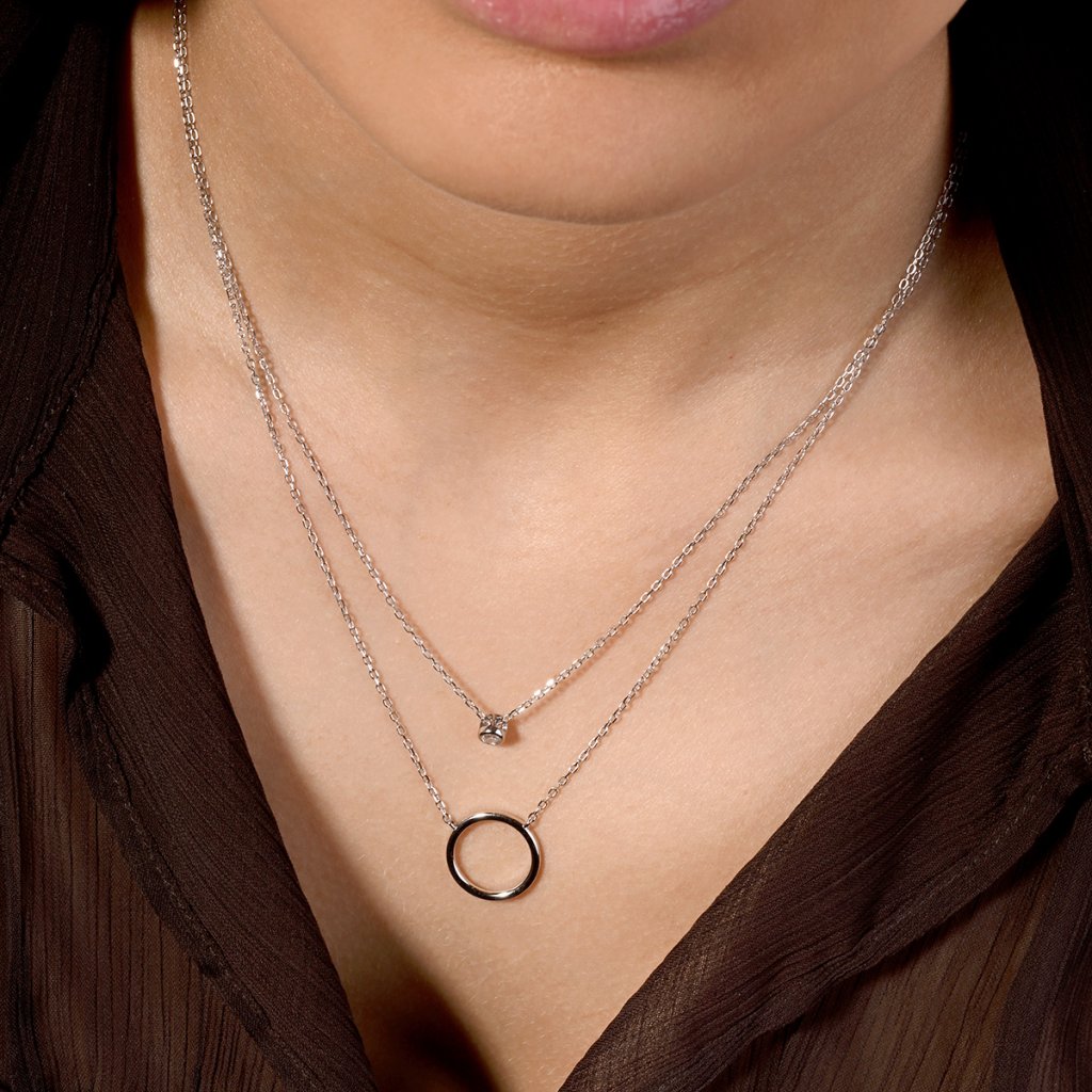 Dopřejte svému stylu křehkou eleganci s tímto půvabným dvojitým náhrdelníkem. Na jednom řetízku se houpe decentní kroužek, zatímco na druhém řetízku se třpytí přívěsek se zirkonem. Tato kombinace kontrastních tvarů - hladkého kruhu a jiskřivého zirkonu - vytváří okouzlující harmonii.