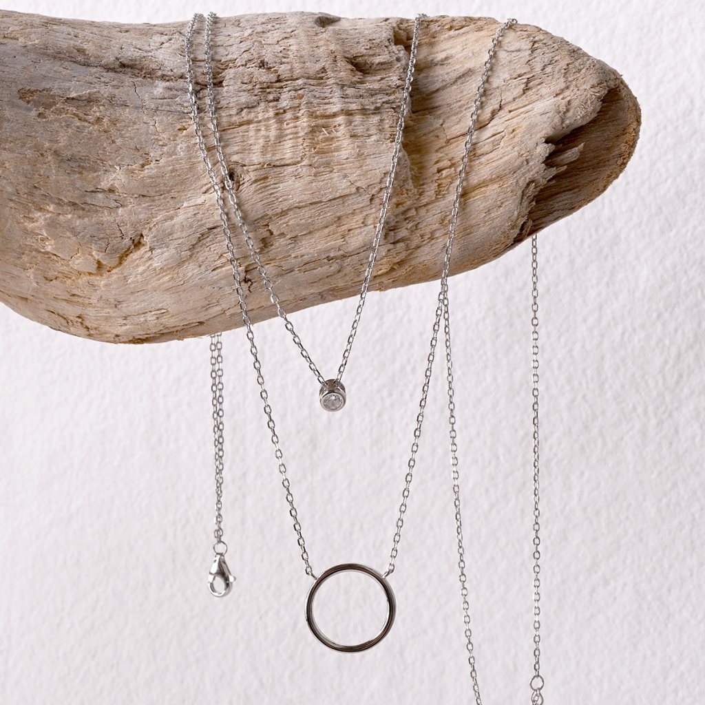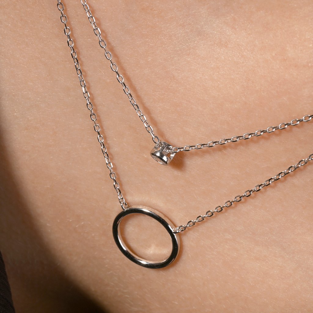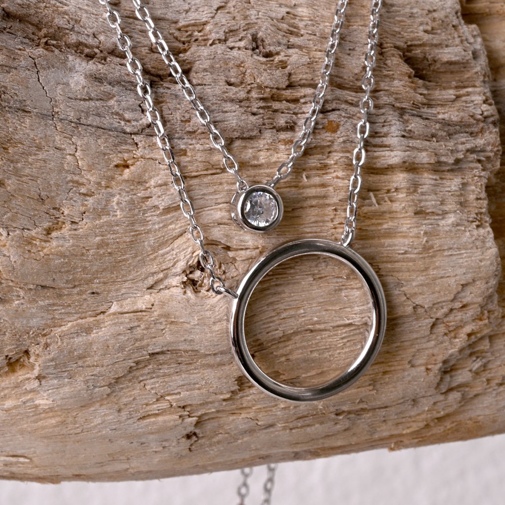 Dopřejte svému stylu křehkou eleganci s tímto půvabným dvojitým náhrdelníkem. Na jednom řetízku se houpe decentní kroužek, zatímco na druhém řetízku se třpytí přívěsek se zirkonem. Tato kombinace kontrastních tvarů - hladkého kruhu a jiskřivého zirkonu - vytváří okouzlující harmonii.