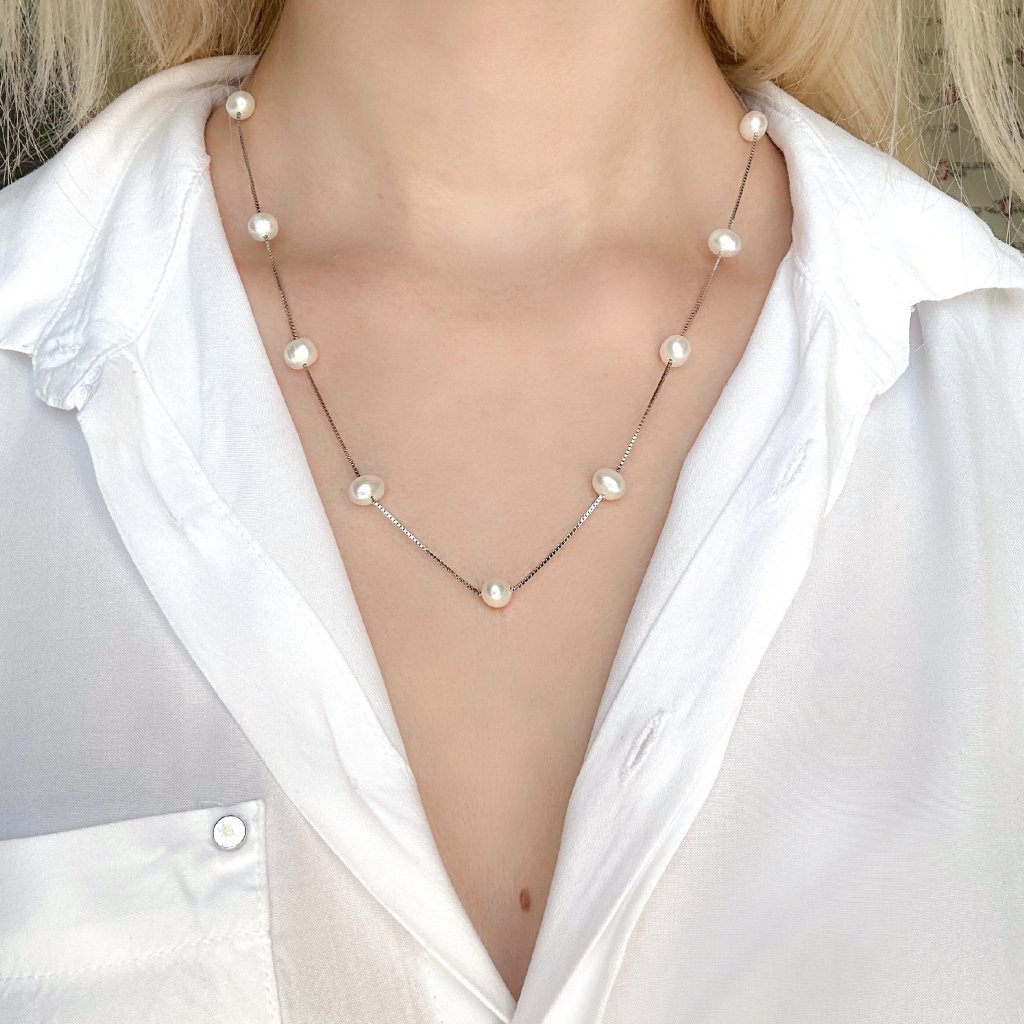 Stříbrný náhrdelník s oválnými říčními perlami na řetízku 22043.1