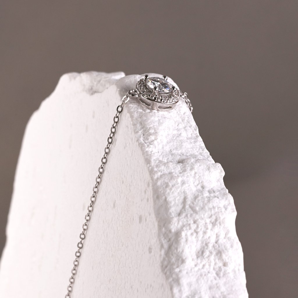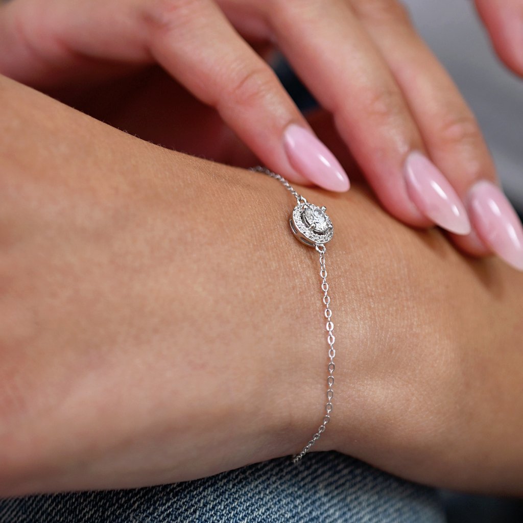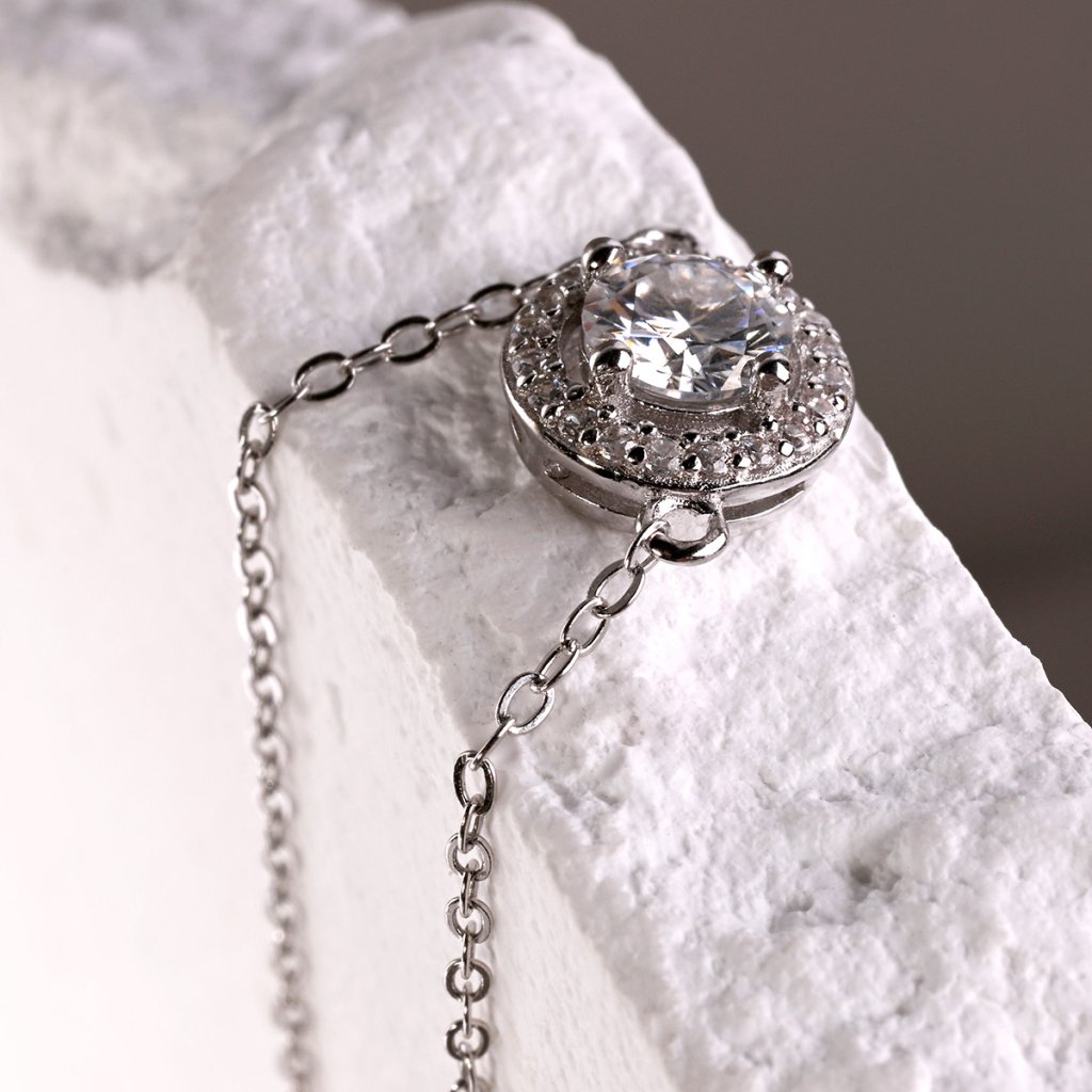 Elegantní stříbrný náramek zdobený velkým kulatým moissanitem, obklopený drobnějšími kamínky, vytváří nádhernou hru světel a třpytu. Náramek je vyroben ze stříbra ryzosti 925/1000. Vrstva z bílého 18 kt. zlata zajišťuje luxusní lesk šperku a jeho dlouhotrvající odolnost. Nastavitelná délka náramku a pohodlné zapínání na karabinku z něj činí dokonalý doplněk pro každou příležitost.