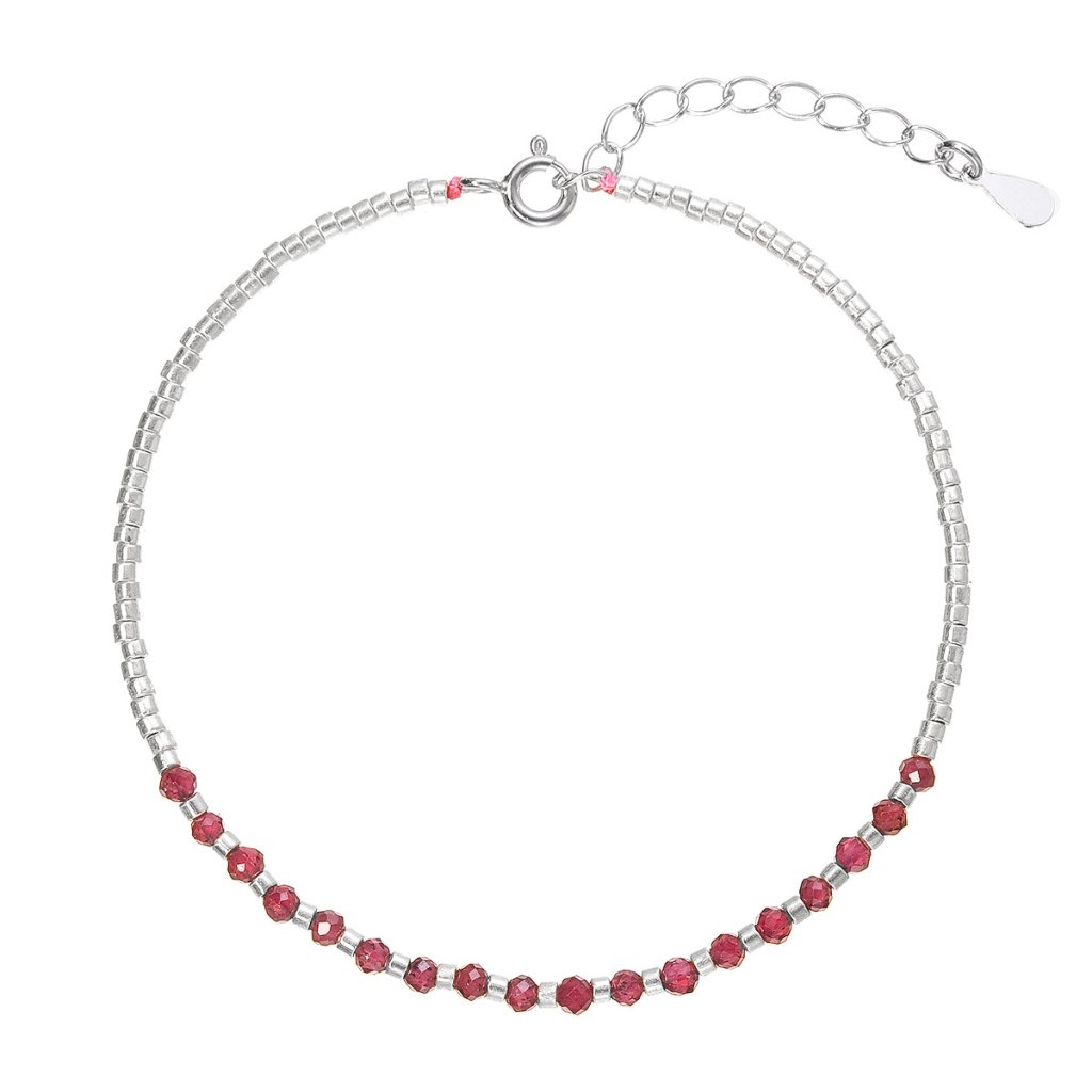 Tento elegantní náramek je vyroben z kvalitního stříbra a zdoben drobnými korálky z pravého granátu v temně červeném odstínu. Skládá se z jemných stříbrných korálků, které tvoří základ náramku, a z části s výraznými granátovými kamínky, jež mu dodávají hloubku a luxusní vzhled.