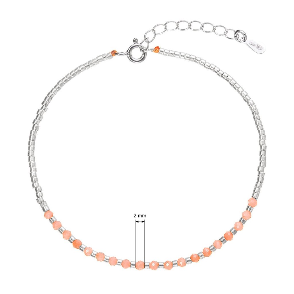 Tento jemný náramek je vyroben z kvalitního stříbra a zdoben drobnými korálky z pravého oranžového korálu. Skládá se z malých stříbrných korálků, které tvoří větší část náramku, a z části s teplými oranžovými kamínky korálu, jež mu dodávají energický a zářivý vzhled.