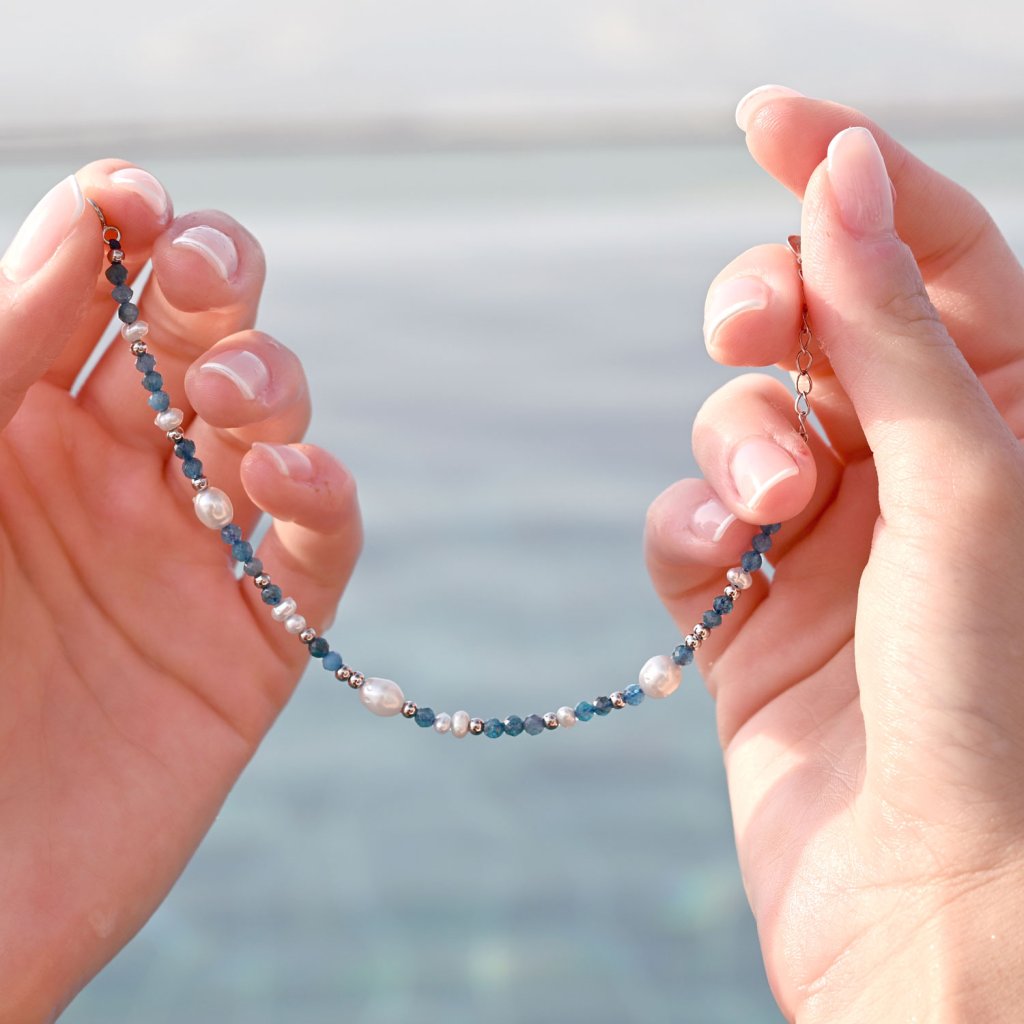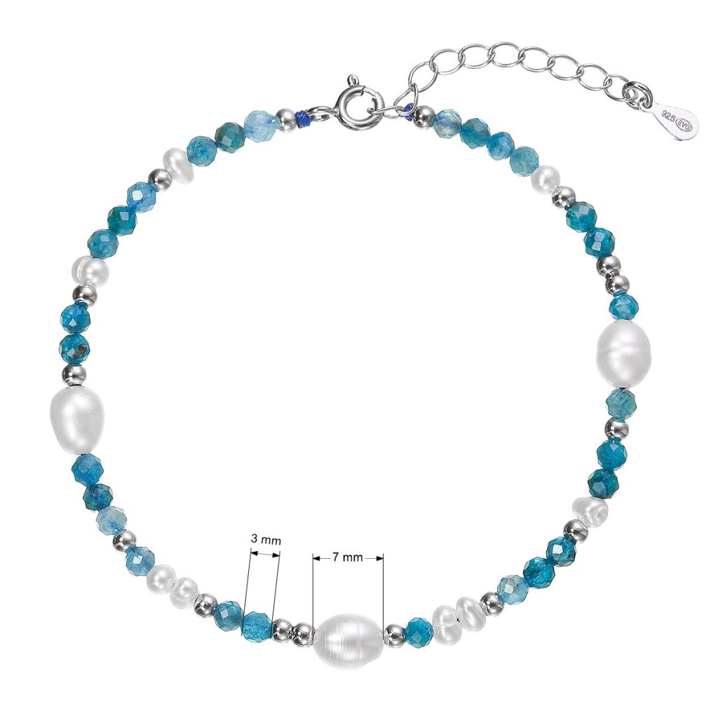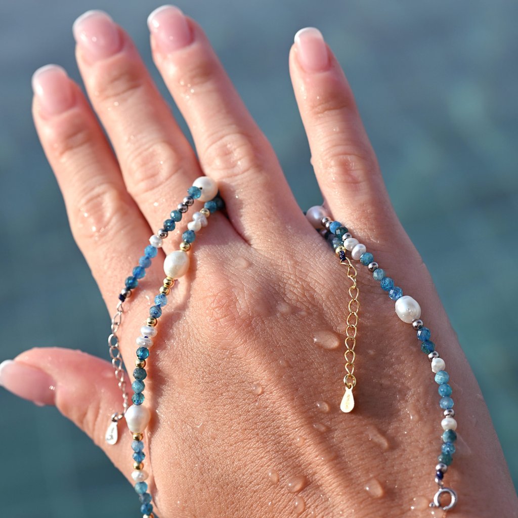 Tento jemný a elegantní náramek je tvořen kombinací pravých říčních perel různých tvarů a drobných korálků apatitu v krásné modré barvě. Lesklé perly s přirozeným perleťovým odleskem působí luxusně, zatímco apatity dodávají šperku svěžest a lehce mořský nádech.
