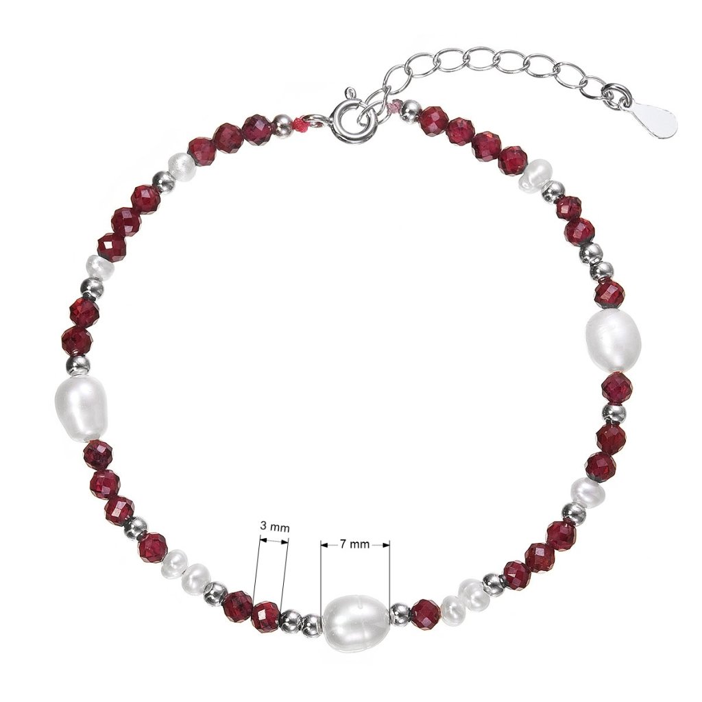 Tento elegantní náramek je tvořen kombinací pravých říčních perel různých tvarů a drobných korálků temně červeného granátu. Lesklé perly s jemným perleťovým odleskem krásně kontrastují se sytou, hlubokou barvou granátu, která šperku dodává výrazný a luxusní charakter.