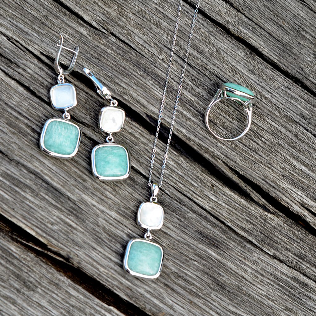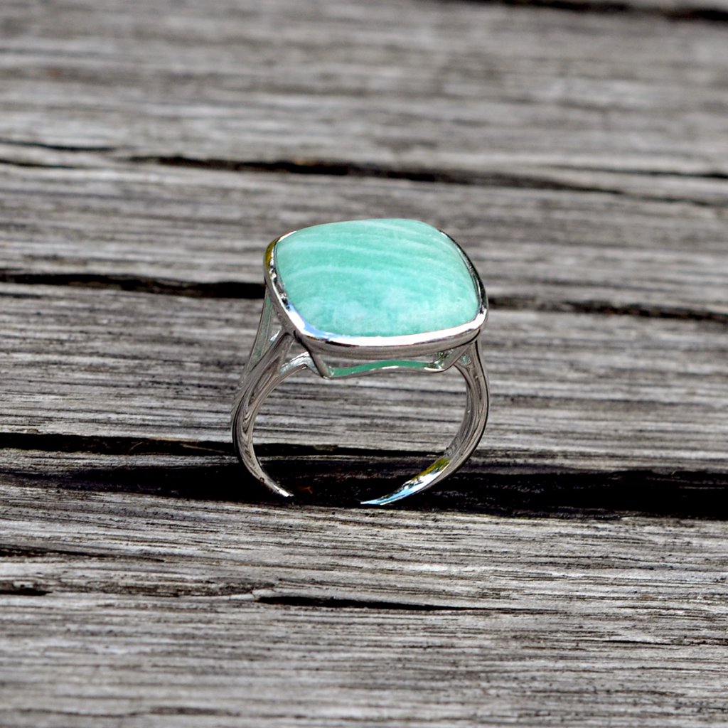 Prsten je vyroben ze stříbra té nejvyšší kvality a jejich povrch je dokonale chráněn rhodiovou úpravou. Rhodium dodává šperku nepřekonatelný lesk a ochranu proti oxidaci. Výrazný čtvercový kámen amazonit v zelenkavých tónech, ohraničený stříbrem vytváří luxusní dojem. Ukrývá energii klidu a vnitřní síly.