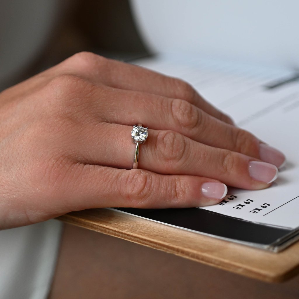Něžný prsten s pravým moissanitem, vhodný jako prsten zásnubní, o průměru 6,5 mm je stvořen pro ty, kteří milují něžné šperky se zářivou krásou. Díky své čisté linii a brilantnímu lesku zaujme a potěší na první pohled. Kulatý moissanit je uchycen čtyřmi krapnami, které mu dodávají jemný čtvercový vzhled.