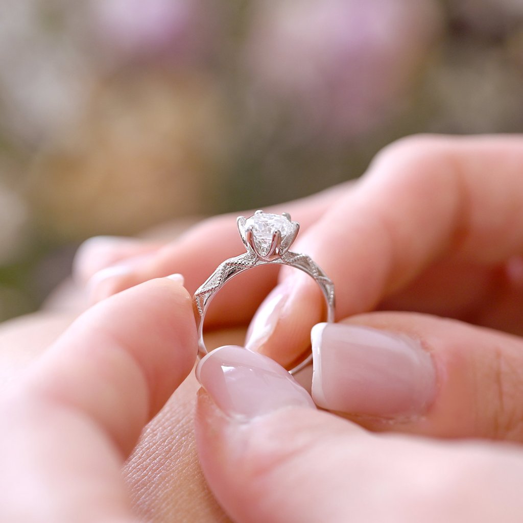 Zásnubní prsten ze stříbra ryzosti 925/1000 s precizními rytými detaily a zářivým pravým moissanitem v klasickém osazení je ztělesněním nadčasové elegance. Ručně zpracovaný vzor na obroučce dodává prstenu výjimečný charakter a jemně historický nádech.