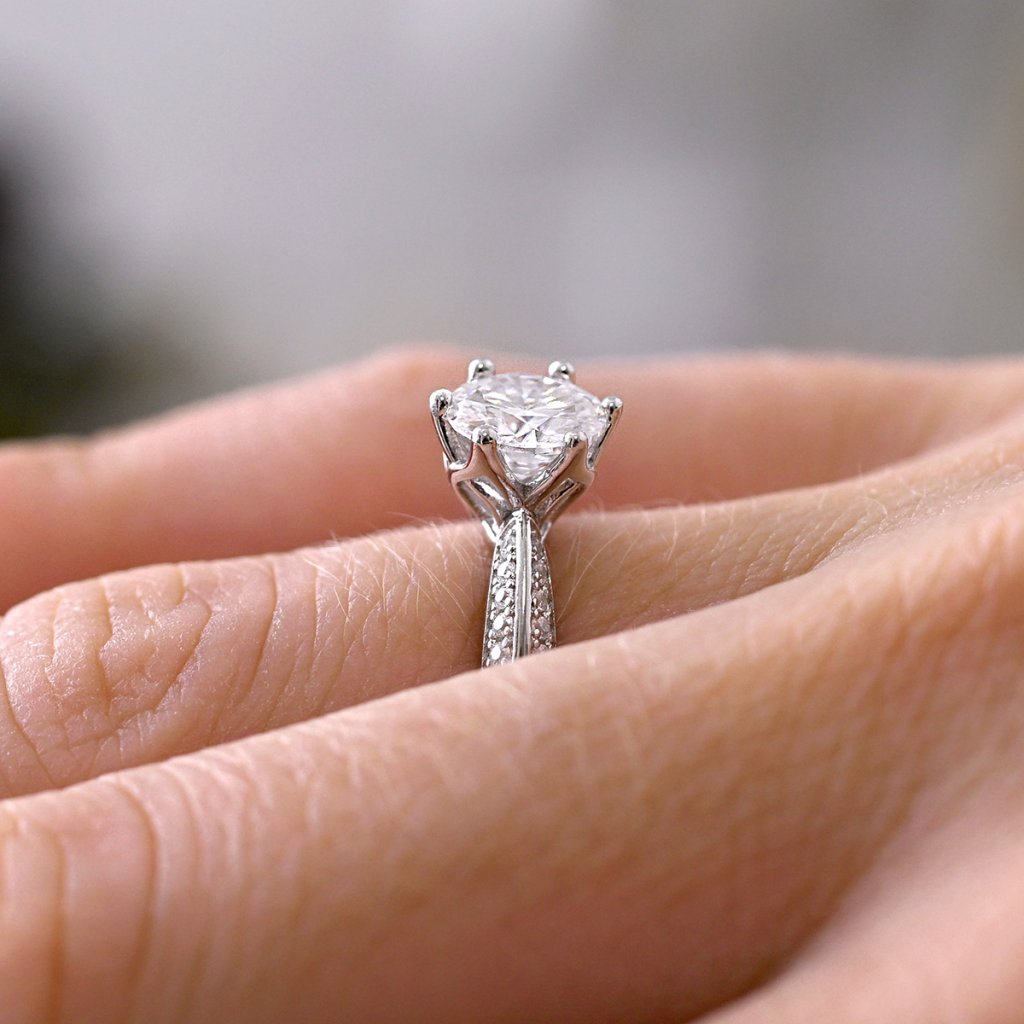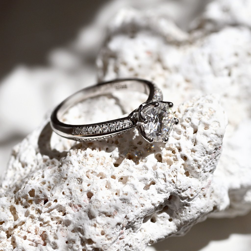 Nejenom zásnubní prsten ze stříbra ryzosti 925/1000 s precizně vsazenými drobnými zirkony a dominantním zářivým pravým moissanitem v klasickém osazení je ztělesněním luxusní elegance. Propracovaný vzor na obroučce dodává prstenu výjimečný charakter a luxusní nádech.