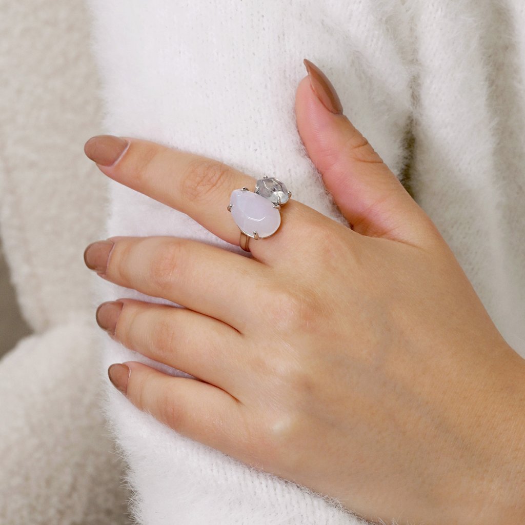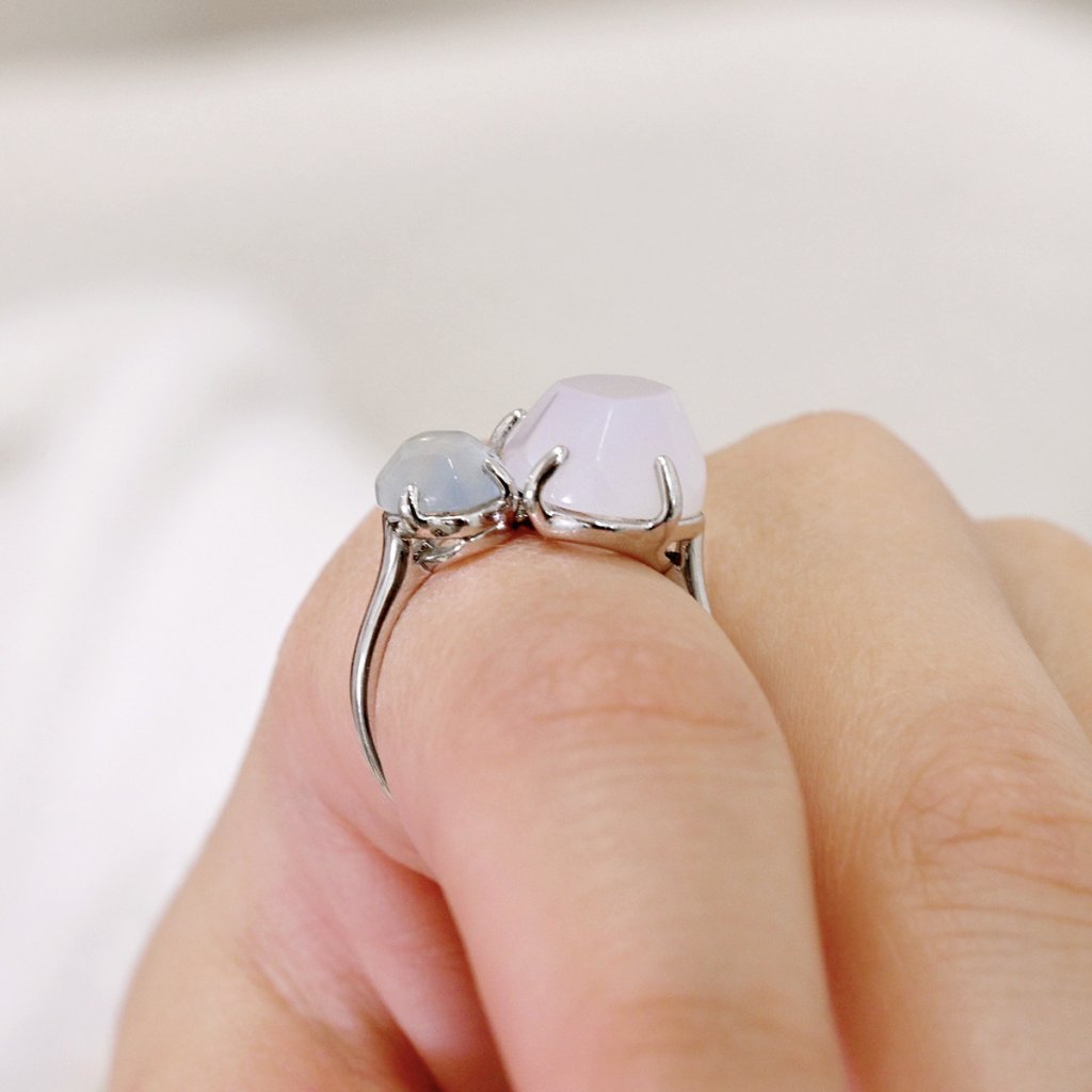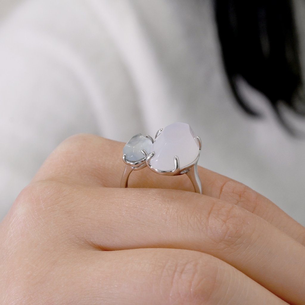 Elegantní a výrazný prsten ze stříbra ryzosti 925/1000 v sobě spojuje dva přírodní drahokamy – světle modrý akvamarín a mléčně modrý chalcedon. Oba kameny jsou zasazeny v otevřeném designu, který působí velmi přírodně a zároveň moderně. Jemné nerovnosti na povrchu kamenů nechávají vyniknout jejich přirozený charakter, takže žádný prsten není úplně stejný – jako každá žena.