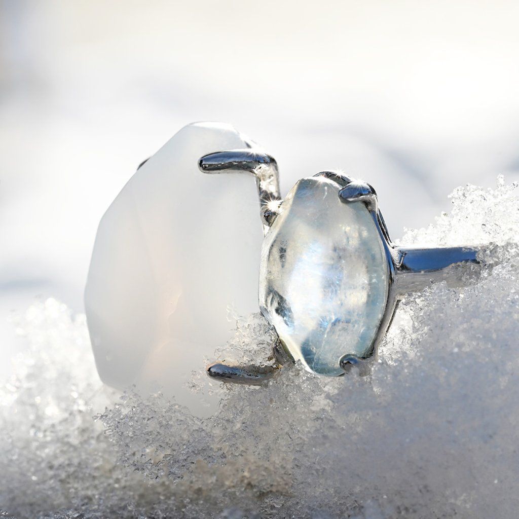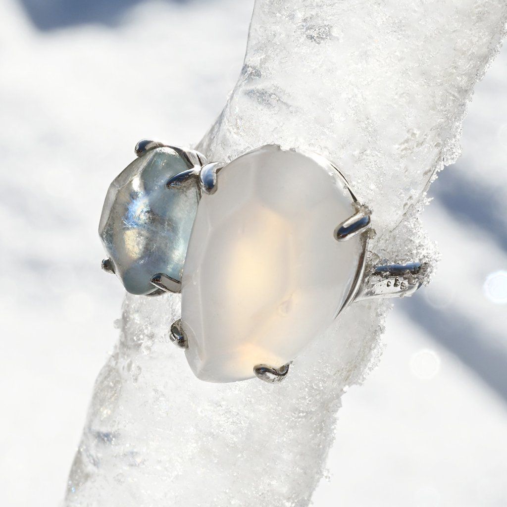 Elegantní a výrazný prsten ze stříbra ryzosti 925/1000 v sobě spojuje dva přírodní drahokamy – světle modrý akvamarín a mléčně modrý chalcedon. Oba kameny jsou zasazeny v otevřeném designu, který působí velmi přírodně a zároveň moderně. Jemné nerovnosti na povrchu kamenů nechávají vyniknout jejich přirozený charakter, takže žádný prsten není úplně stejný – jako každá žena.