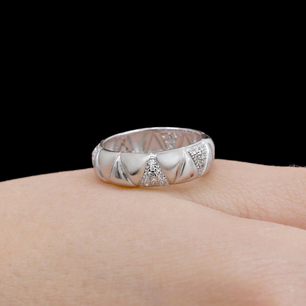 Zářivý prsten se vzorem střídavě se zirkony a lesklý kov, zcela jistě zaujme na první pohled je symbolem elegance a ženské jemnosti.