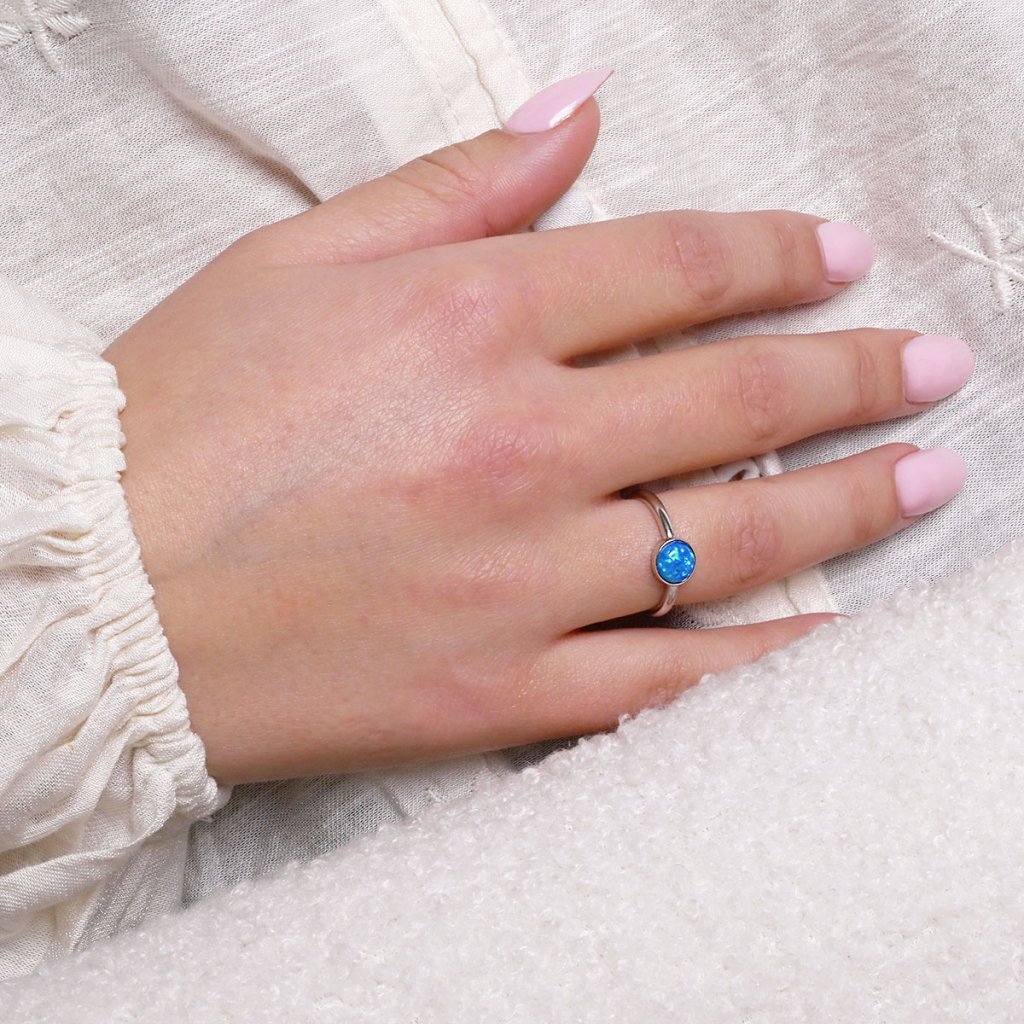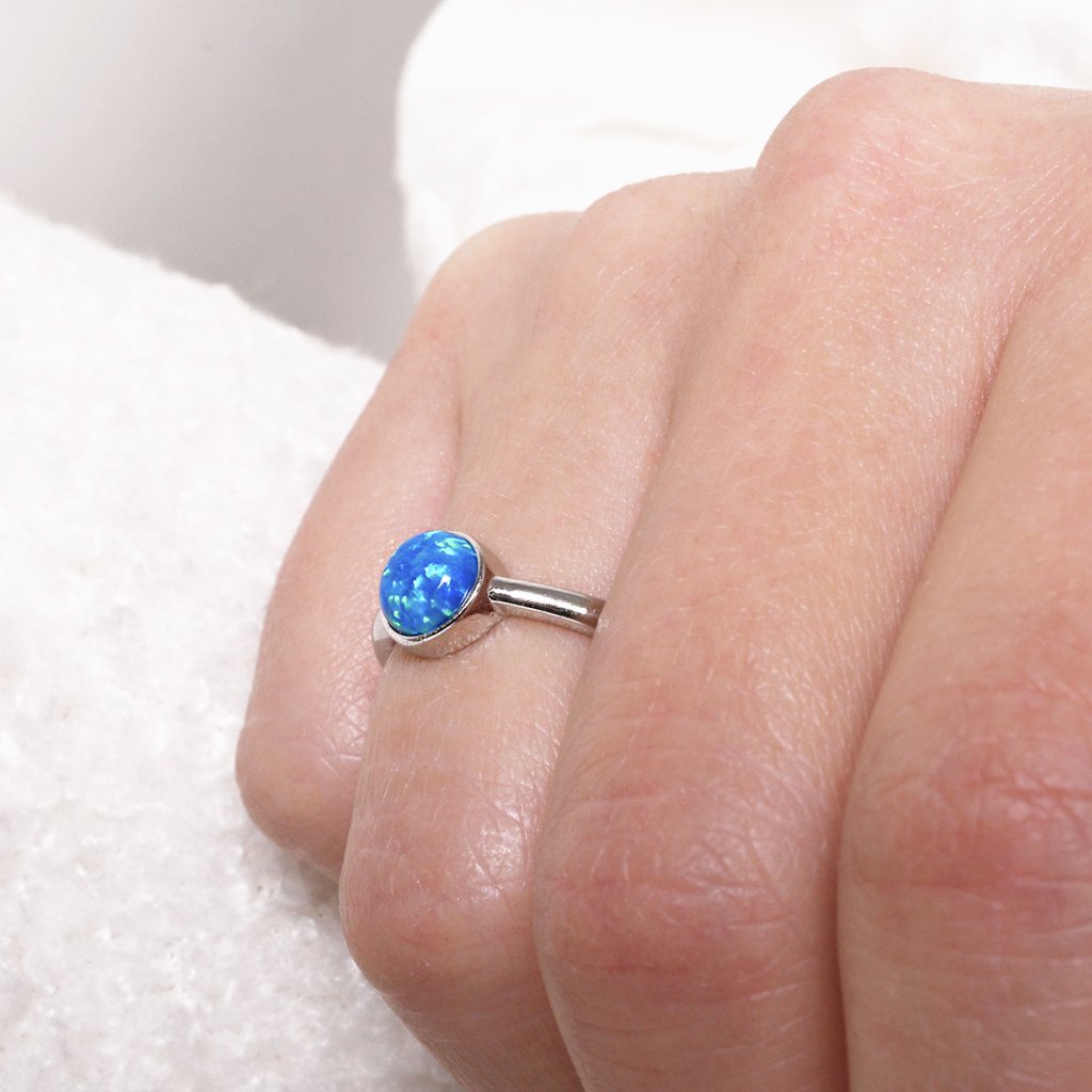 Zdobí jej kulatý syntetický opál v modré barvě.