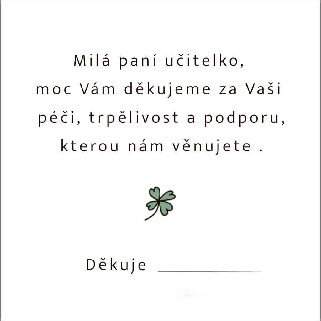 Milé poděkování ve formě jednoduché kartičky se čtyřlístkem a vřelým textem: „Milá paní učitelko, moc Vám děkujeme za Vaši péči, trpělivost a podporu, kterou nám věnujete. Děkuje....“