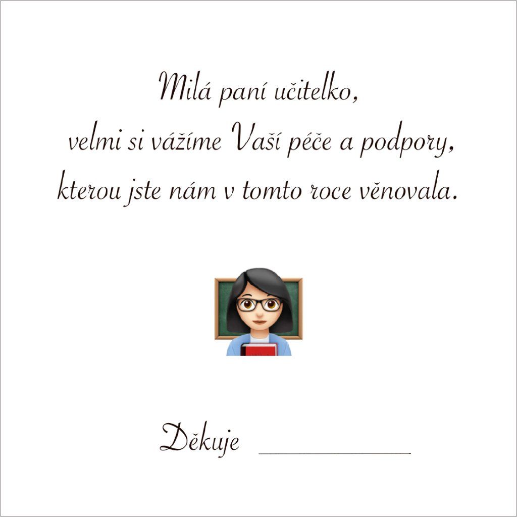 Milé poděkování ve formě jednoduché kartičky s obrázkem učitelky a vřelým textem: „Milá paní učitelko, velmi si vážíme Vaší péče a podpory, kterou jste nám v tomto roce věnovala. Děkuje..."